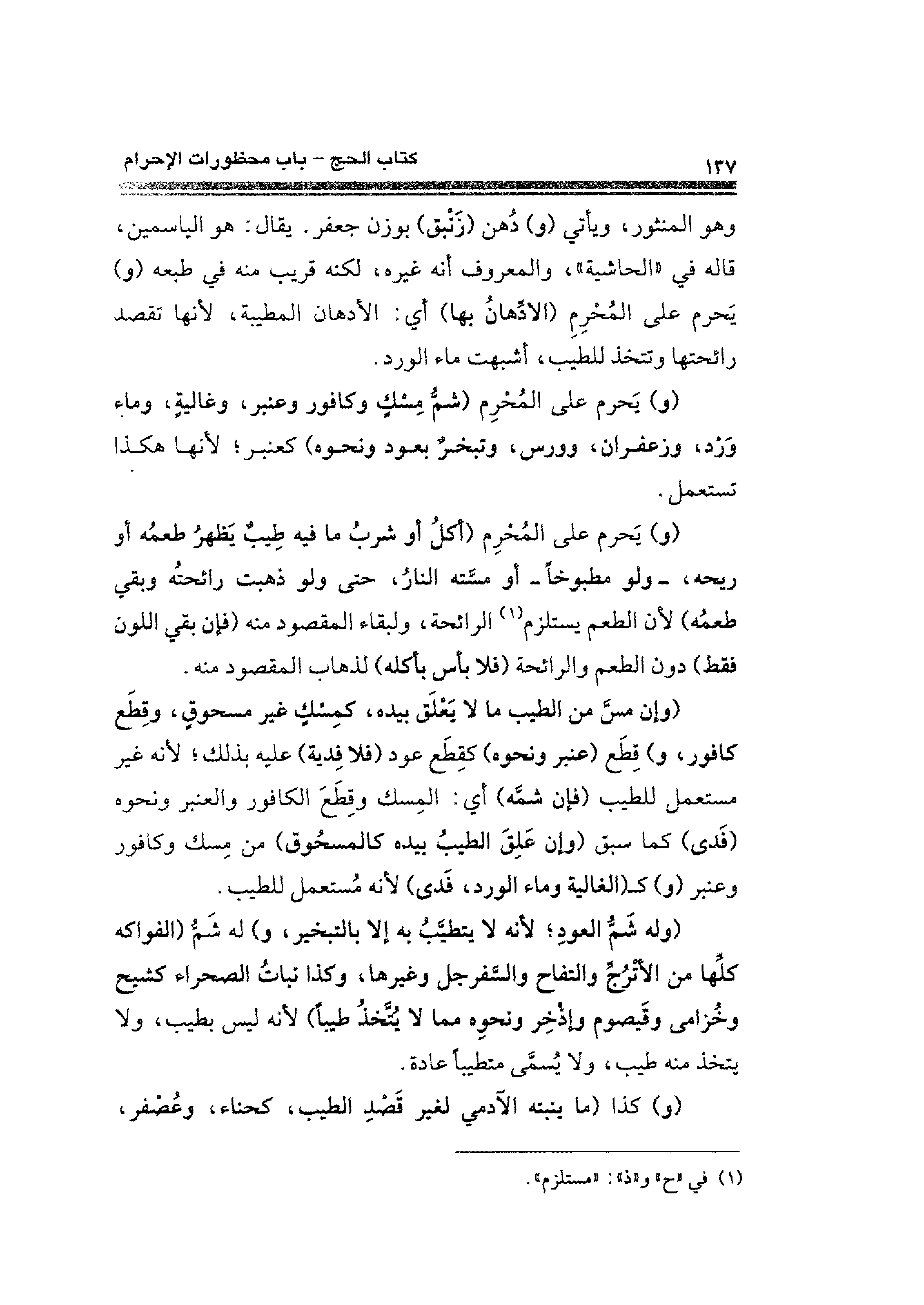 (و) يَحرم على المُحْرِم (أ كلُ أو شربُ ما فيه طِيبٌ يَظهرُ طعمُه أو ريحه، -ولو مطبوخًا -أو مسَّته النارُ، حتى ولو ذهبت رائحتُه وبقي طعمُه) لأن الطعم يستلزم (¬١) الرائحة، ولبقاء المقصود منه (فإن بقي اللون فقط) دون الطعم والرائحة (فلا بأس بأكله) لذهاب المقصود منه.