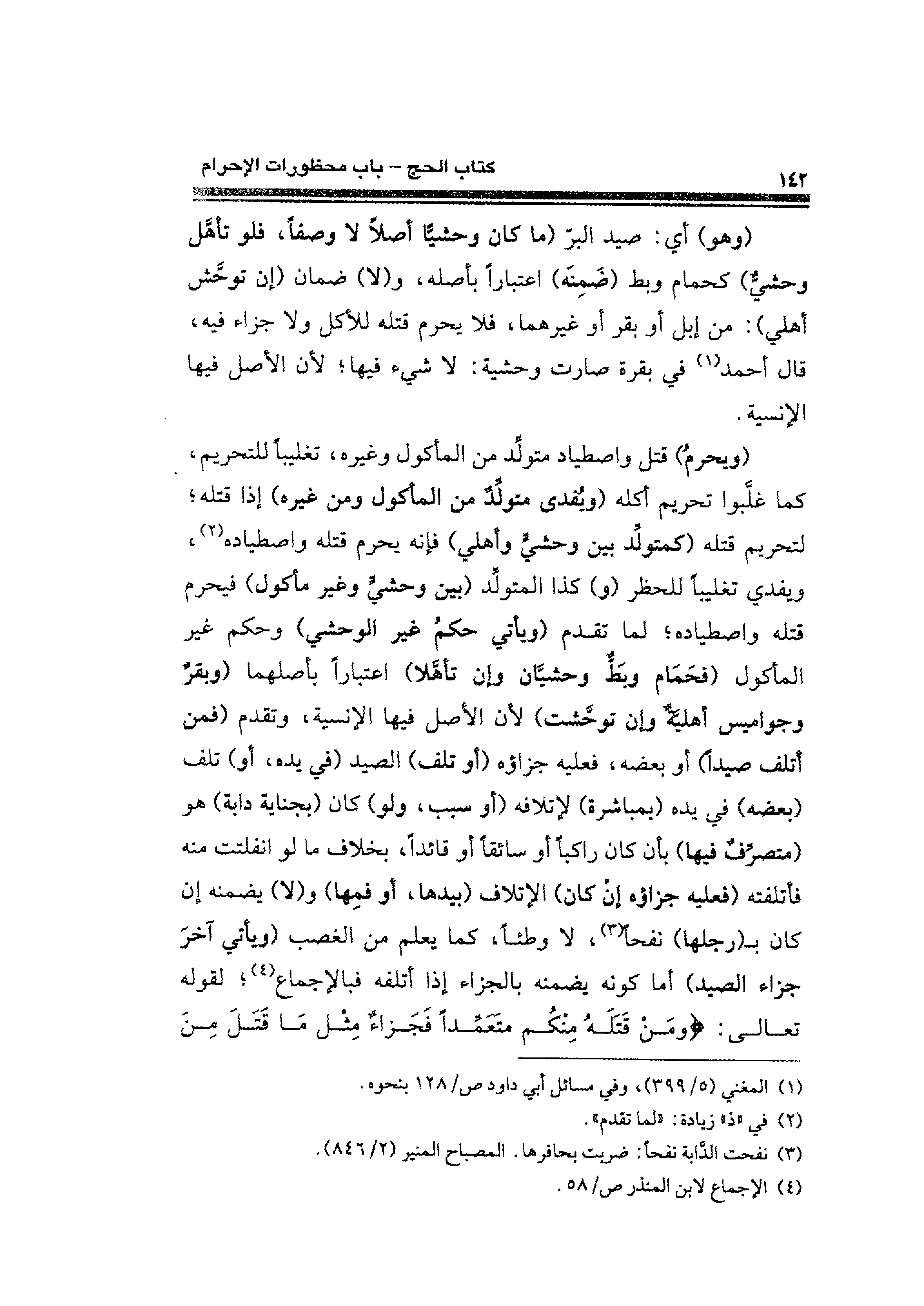 (ويحرم) قتل واصطياد متولِّد من المأكول وغيره، تغليبا للتحريم، كما غلَّبوا تحريم أكله (ويُفدى متولدٌ من المأكول ومن غيره) إذا قتله؛ لتحريم قتله (كمتولِّد بين وحشيٍّ وأهلي) فإنه يحرم قتله واصطياده (¬٢)، ويفدي تغليبا للحظر (و) كذا المتولد (بين وحشي وغير مأكول) فيحرم قتله واصطياده؛ لما تقدم (ويأتي حكمُ غير الوحشي) وحكم غير المأكول (فحَمَام وبَطٌّ وحشيان وإن تأهلا) اعتبارًا بأصلهما (وبقرٌ وجواميس أهلية وإن توحّشت) لأن الأصل فيها الإنسية، وتقدم (فمن أتلف صيدًا)، أو بعضه، فعليه جزاؤه (أو تلف) الصيد (في يده، أو) تلف (بعضه) في يده (بمباشرة) لإتلافه (أو سبب، ولو) كان (بجناية دابة) هو (متصرِّفٌ فيها) بأن كان راكبا أو سائقا أو قائدًا، بخلاف ما لو انفلتت منه فأتلفته (فعليه جزاؤه إن كان) الإتلاف (بيدها، أو فمِها) و (لا) يضمنه إن كان بـ (رجلها) نفحًا (¬٣)، لا وطئًا، كما يعلم من الغصب (ويأتي آخرَ جزاء الصيد) أمَّا كونه يضمنه بالجزاء إذا أتلفه فبالإجماع (¬٤)؛ لقوله تعالى: {وَمَنْ قَتَلَهُ مِنْكُمْ مُتَعَمِّدًا فَجَزَاءٌ مِثْلُ مَا قَتَلَ مِنَ