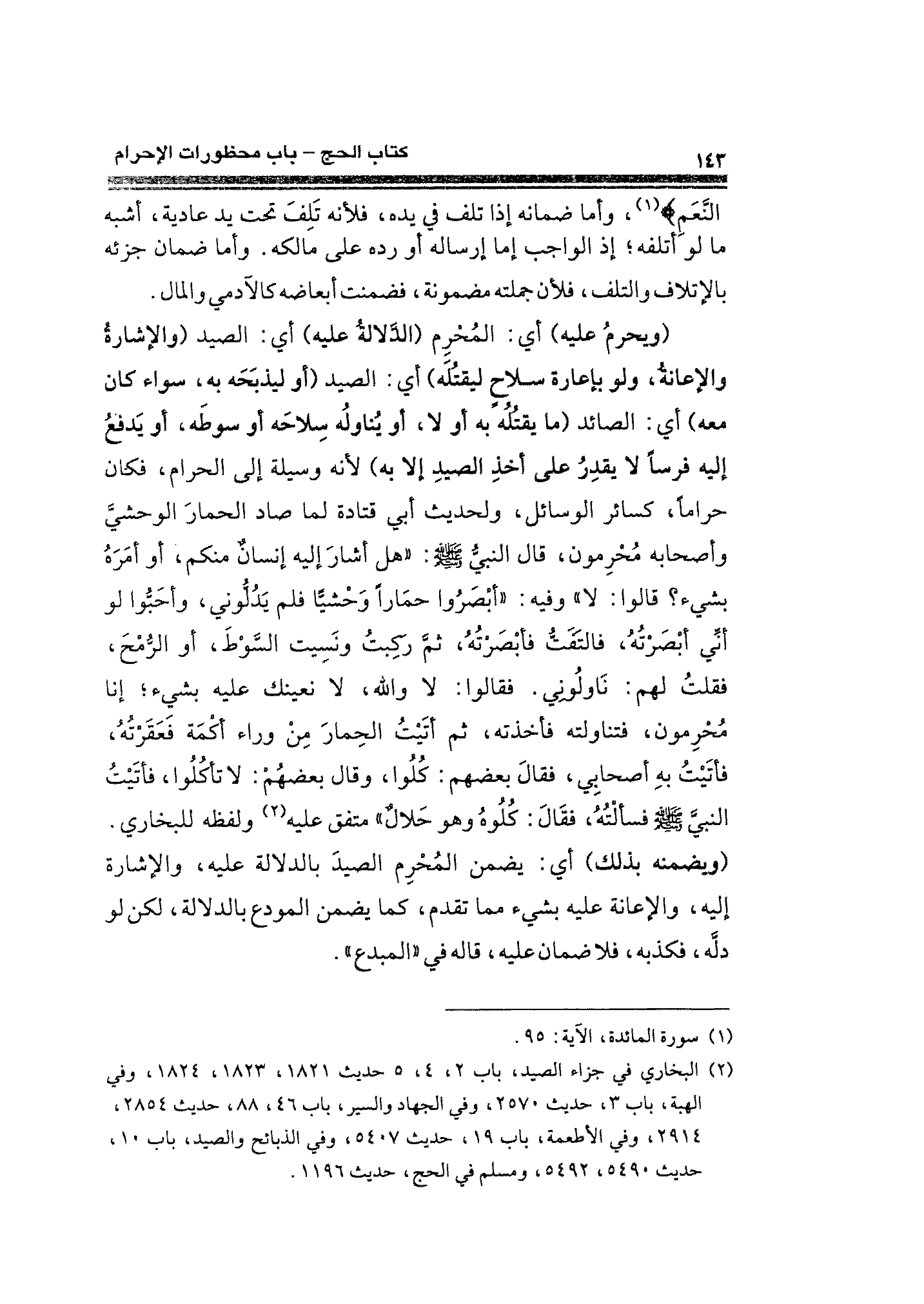 (ويحرمُ عليه) أي: المُحرِم (الدلالة عليه) أي: الصيد (والإشارةُ والإعانةُ، ولو بإعارة سلاح ليقتله) أي: الصيد (أو ليذبَحَه به، سواء كان معه) أي: الصائد (ما يقتله به أو لا، أو يناولُه سِلاحَه أو سوطَه، أو يَدفعُ إليه فرسًا لا يقدِر على أخذِ الصيدِ إلا به) لأنه وسيلة إلى الحرام، فبهان حرامًا، كسائر الوسائل، ولحديث أبي قتادة لما صاد الحمارَ الوحشي وأصحابه محْرِمون، قال النبي - صلى الله عليه وسلم -: "هل أشارَ إليه إنسانٌ منكم، أو أمَرَهُ بشيء؟ قالوا: لا" وفيه: "أبْصَرُوا حمَارًا وَحشيًّا فلم يَدُلوني، وأحَبوا لو أنِّي أبْصَرتُهُ، فالتفت فأبْصَرْتُه، ثمّ ركِبت؛ ونَسِيت السوْطَ، أو الرُّمْحَ، فقلتُ لهم: نَاولُوني. فقالوا: لا والله، لا نعينك عليه بشيء؛ إنا محْرِمون، فتناولته فأخذته، ثم أتَيتُ الحِمارَ مِن وراء أكمَة فَعَقَرْتهُ، فأتَيتُ بهِ أصحابي، فقال بعضهم: كلوا، وقال بعضهمْ: لا تأكُلُوا، فأتَيتُ النبي - صلى الله عليه وسلم - فسألتُهُ، فقَال: كلوه وهو حَلال" متفق عليه (¬٢) ولفظه للبخاري. (ويضمنه بذلك) أي: يضمن المُحرِم الصيدَ بالدلالة عليه، والإشارة إليه، والإعانة عليه بشيء مما تقدم، كما يضمن المودع بالدلالة، لكن لو دلَّه، فكذبه، فلا ضمان عليه، قاله في "المبدع".