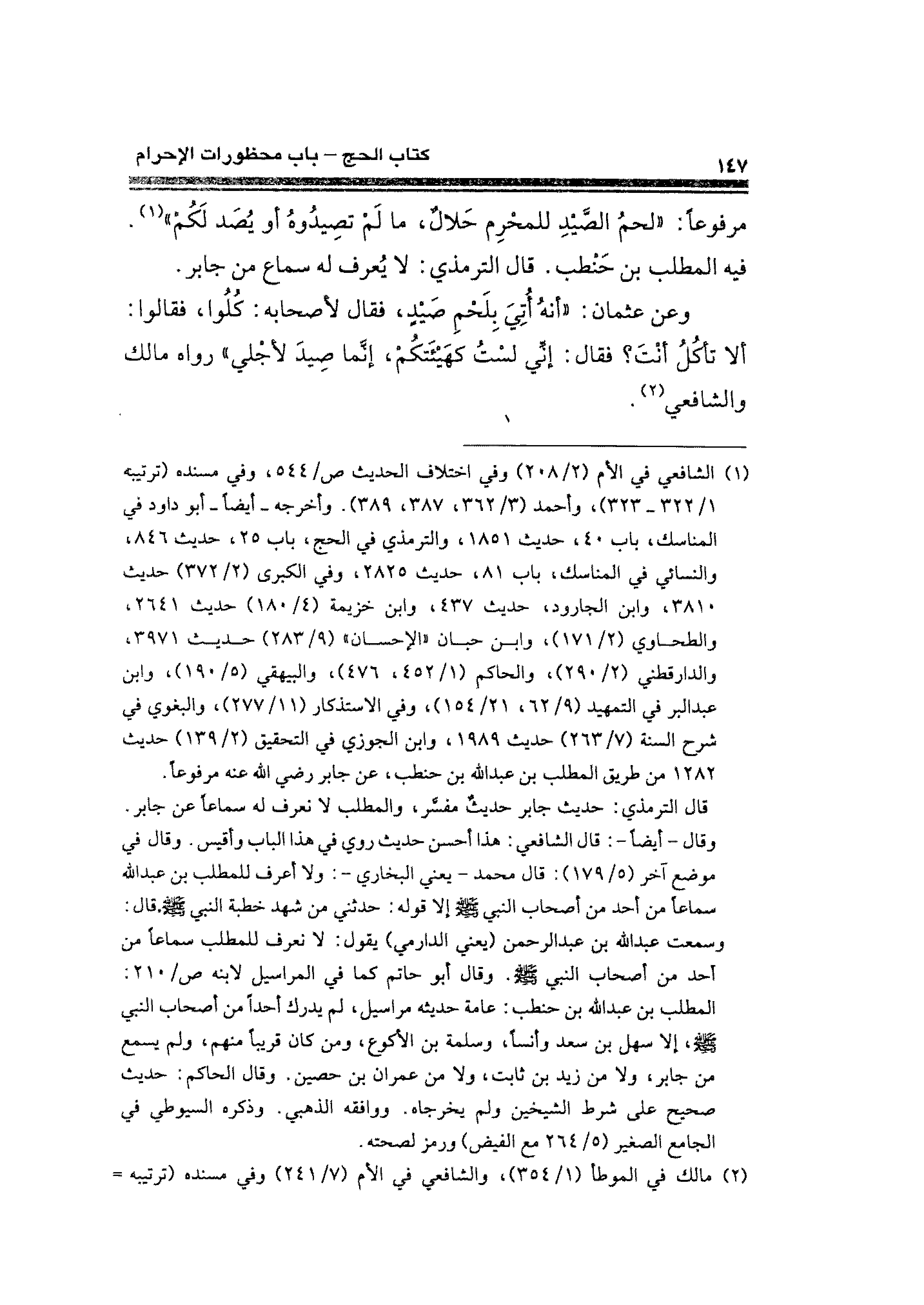 (¬١) الشافعي في الأم (٢/ ٣٠٨) وفي اختلاف الحديث ص / ٥٤٤، وفي مسنده (ترتيبه ١/ ٣٢٢ - ٣٢٣)، وأحمد (٣/ ٣٦٢، ٣٨٧، ٣٨٩). وأخرجه أيضًا -أبو داود في المناسك، باب ٤٠، حديث ١٨٥١، والترمذي في الحج، باب ٢٥، حديث ٨٤٦، والنسائي في المناسك، باب ٨١، حديث ٢٨٣٥، وفي الكبرى (٢/ ٣٧٢) حديث ٣٨١٠، وابن الجارود، حديث ٤٣٧، وابن خزيحة (٤/ ١٨٠) حديث ٢٦٤١، والطحاوي (٢/ ١٧١)، وابن حبان "الإحسان" (٩/ ٢٨٣) حديث ٣٩٧١، والدارقطني (٢/ ٢٩٠)، والحكم (١/ ٤٥٢، ٤٧٦)، والبيهقي (٥/ ١٩٠)، وابن عبد البر في التمهيد (٩/ ٦٢، ٢١/ ١٥٤)، وفي الاستذكار (١١/ ٢٧٧)، والبغوي في شرح السنة (٧/ ٢٦٣) حديث ١٩٨٩، وابن الجوزي في التحقيق (٢/ ١٣٩) حديث ١٢٨٢ عن طريق المطلب بن عبد الله بن حنطب، عن جابر رضي الله عنه مرفوعًا.