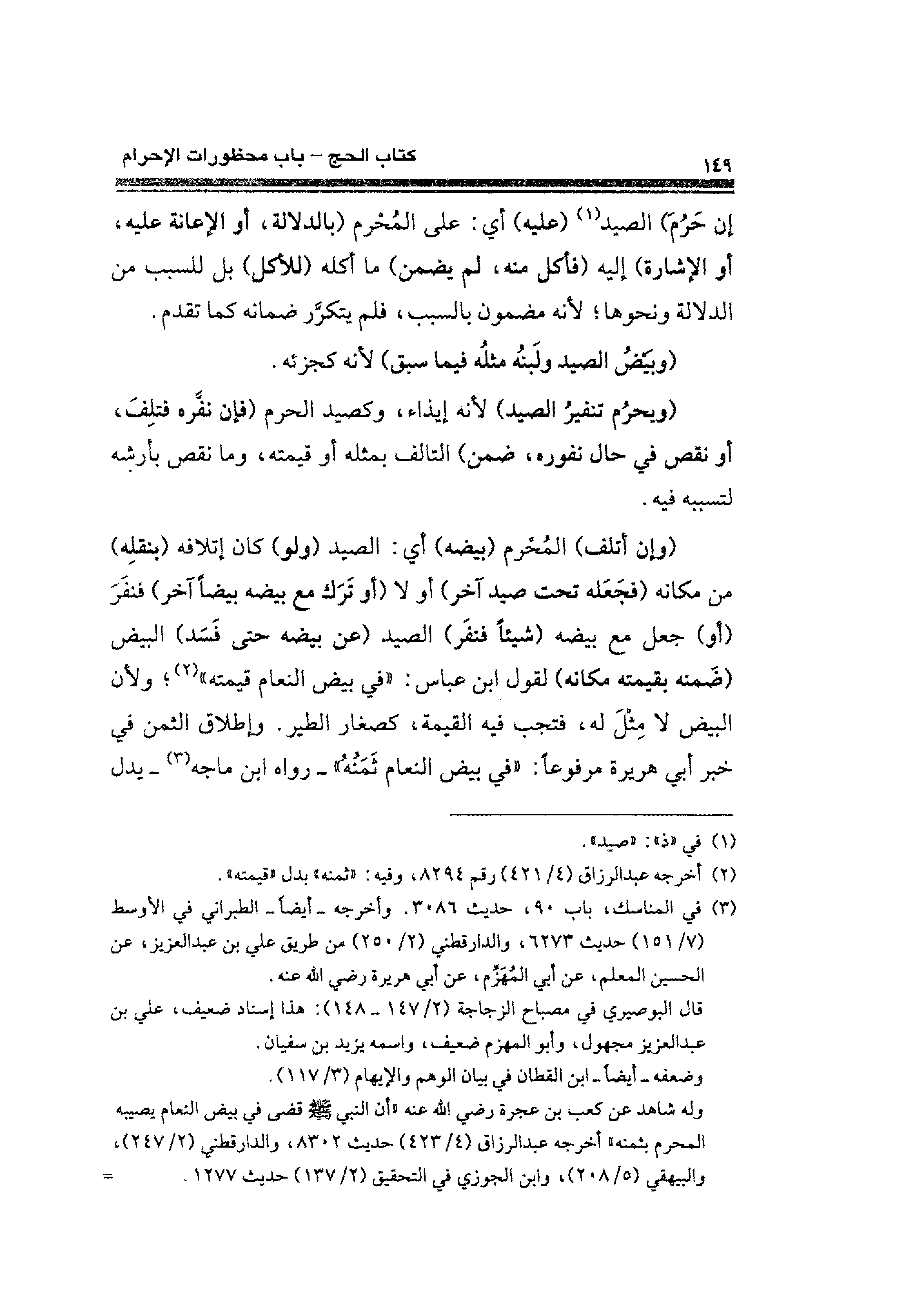 وله شاهد عن كعب بن عجرة رضي الله عنه "أن النبي - صلى الله عليه وسلم - قضى في بيض النعام يصيبه المحرم بثمنه" أخرجه عبد الرزاق (٤/ ٤٢٣) حديث ٨٣٠٢، والدارقطني (٢/ ٢٤٧)، والبيهقي (٥/ ٢٠٨)، وابن الجوزي في التحقيق (٢/ ١٣٧) حديث ١٢٧٧. =