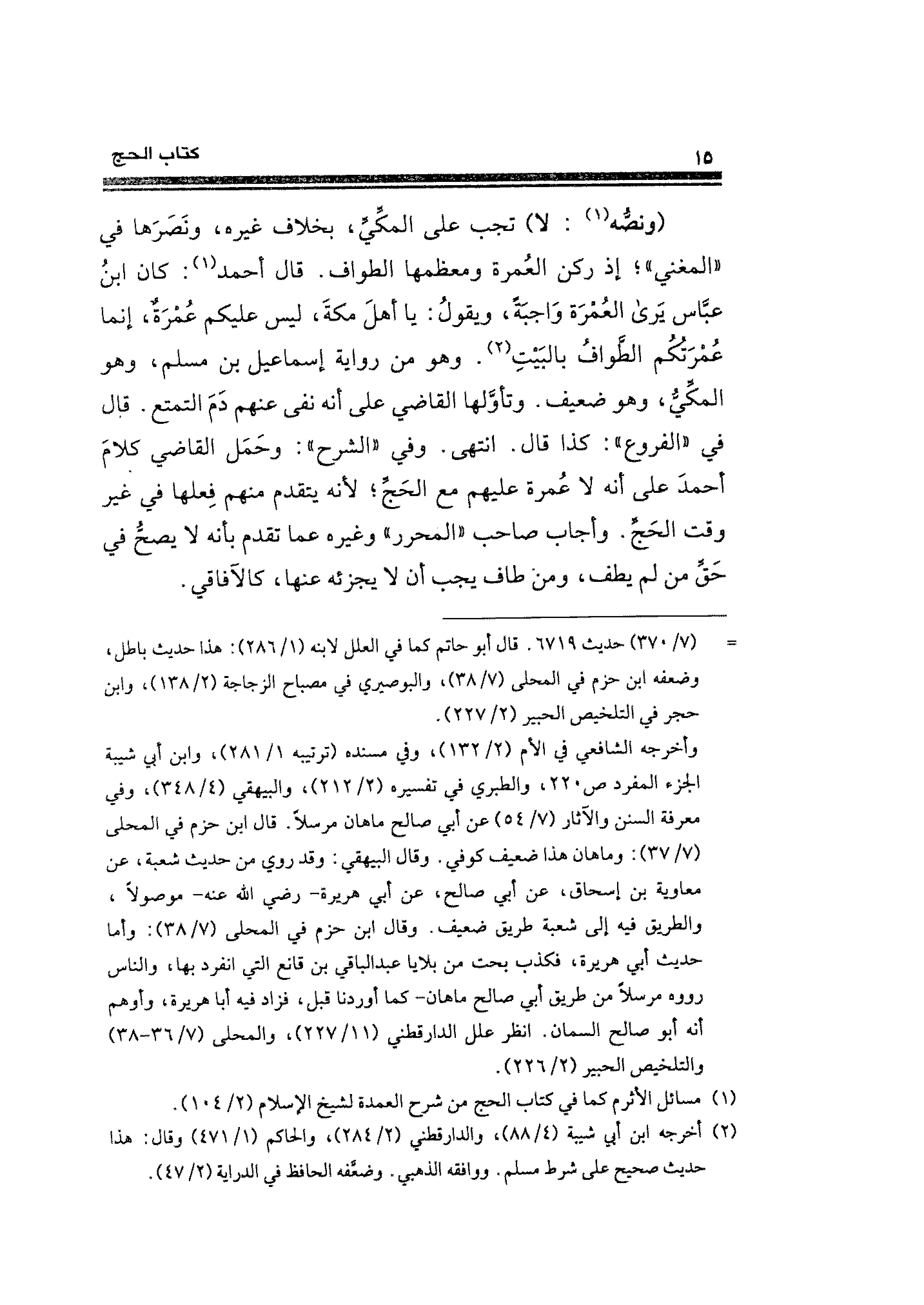 (ونصُّه (¬١): لا) تجب على المكِّيِّ، بخلاف غيره، ونَصَرَها في "المغني"؛ إذ ركن العُمرة ومعظمها الطواف. قال أحمد (¬١): كان ابنُ عبَّاس يَرى العُمْرَة وَاجبَةً، ويقولُ: يا أهلَ مكةَ، ليس عليكم عُمْرَةٌ، إنما عُمْرَتُكُم الطَّوافُ بالبَيتِ (¬٢). وهو من رواية إسماعيل بن مسلم، وهو المكَّيُّ، وهو ضعيف. وتأوَّلها القاضي على أنه نفى عن دَمَ التمتع. قال في "الفروع": كذا قال. انتهى. وفي. "الشرح": وحَمَل القاضي كلامَ أحمدَ على أنه لا عُمرة عليهم مع الحَجِّ؛ لأنه يتقدم منهم فِعلها في غير وقت الحَجِّ. وأجاب صاحب "المحرر" وغيره عما تقدم بأنه لا يصحُّ في حَقِّ من لم يطف، وعن طاف يجب أن لا يجزئه عنها، كالآفاقي.