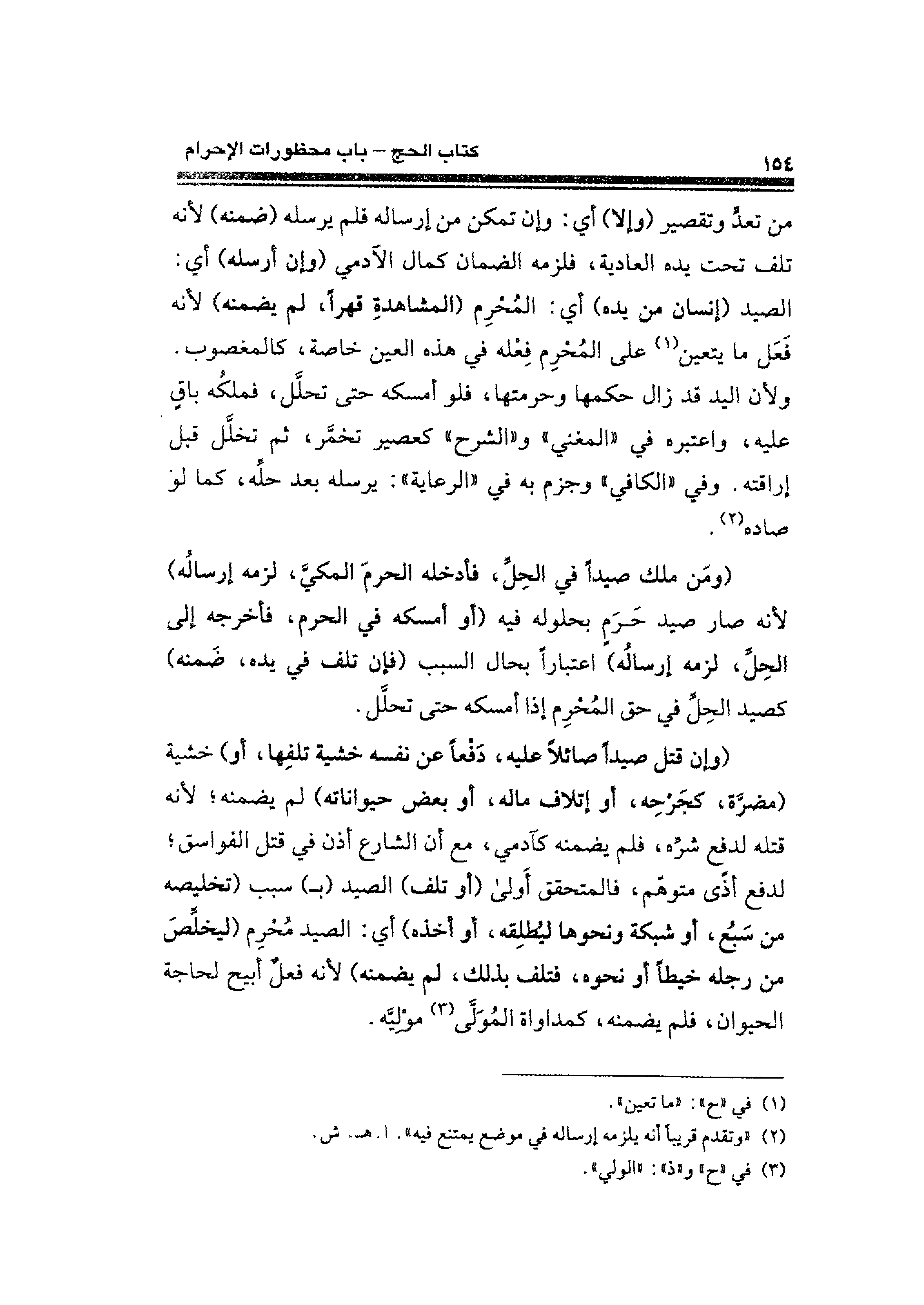 من تعدٍّ وتقصير (وإلا) أي: وإن تمكن من إرساله فلم يرسله (ضمنه) لأنَّه تلف تحت يده العادية، فلزمه الضمان كمال الآدمي (وإن أرسله) أي: الصيد (إنسان من يده) أي: المحرم (المشاهدةِ قهرًا، لم يضمنه) لأنه فَعَل ما يتعين (¬١) على المحرم فِعله في هذه العين خاصة، كالمغصوب. ولأن اليد قد زال حكمها وحرمتها، فلو أمسكه حتَّى تحلل، فملكُه باق عليه، واعتبره في "المغني" و"الشرح" كعصير تخمّر، ثم تخلَّل قبل إراقته. وفي "الكافي "وجزم به في "الرعاية" يرسله بعد حله، كما لو صاده (¬٢).