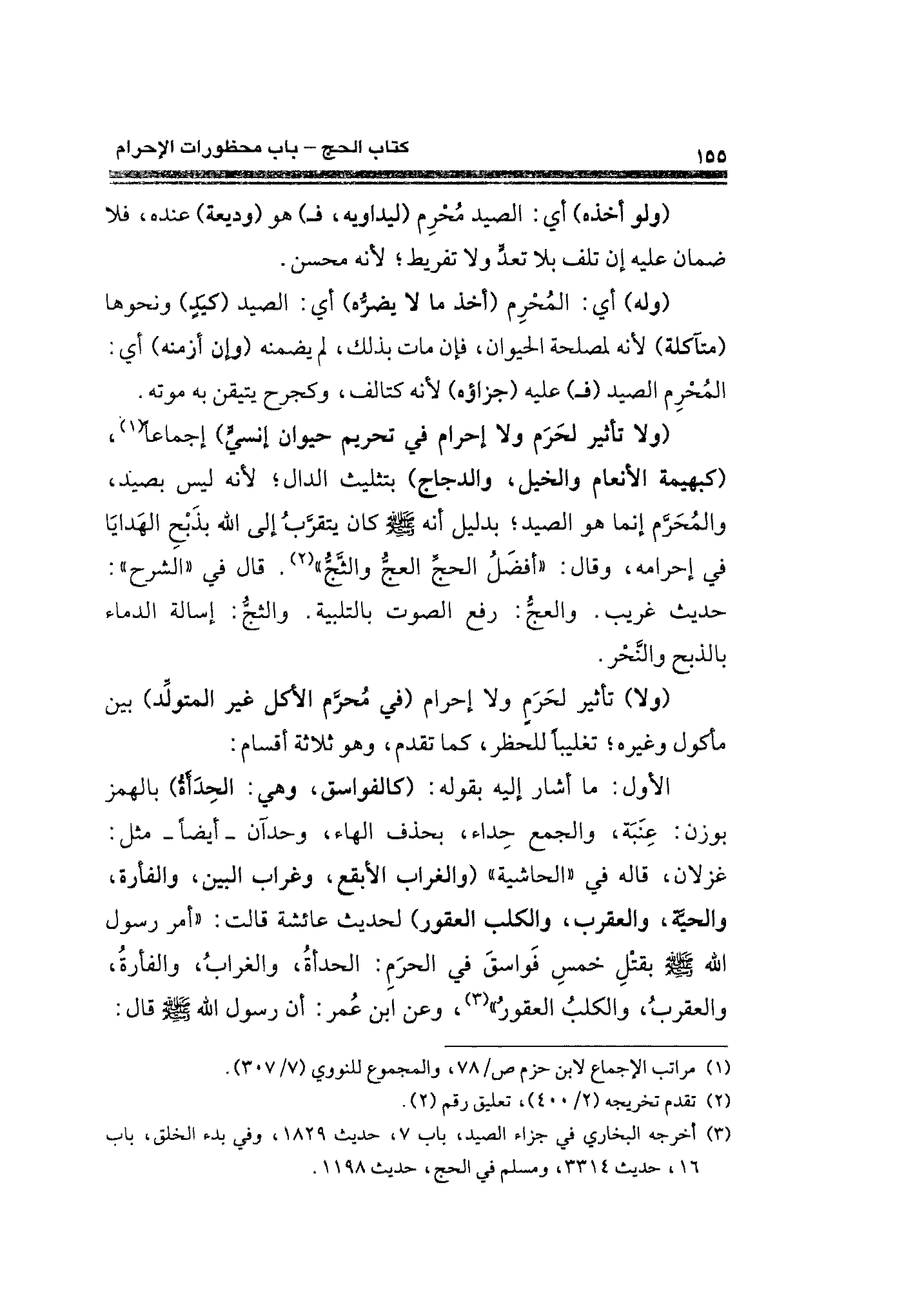 (ولا تأثير لحَرَم ولا إحرام في تحريم حيوان إِنسي) إجماعًا (¬١)، (كبهيمة الأنعام والخيل، والدجاج) بتثليث الدال؛ لأنَّه ليس بصيد، والمحرم إنما هو الصيد؛ بدليل أنَّه - صلى الله عليه وسلم - كان يتقربُ إلى الله بذَبحِ الهَدايا في إحرامه، وقال: "أفضَلُ الحجِّ العج والثج" (¬٢). قال في "الشَّرح": حديث غريب. والعج: رفع الصوت بالتلبية. والثج: إسالة الدماء بالذبح والنحر.