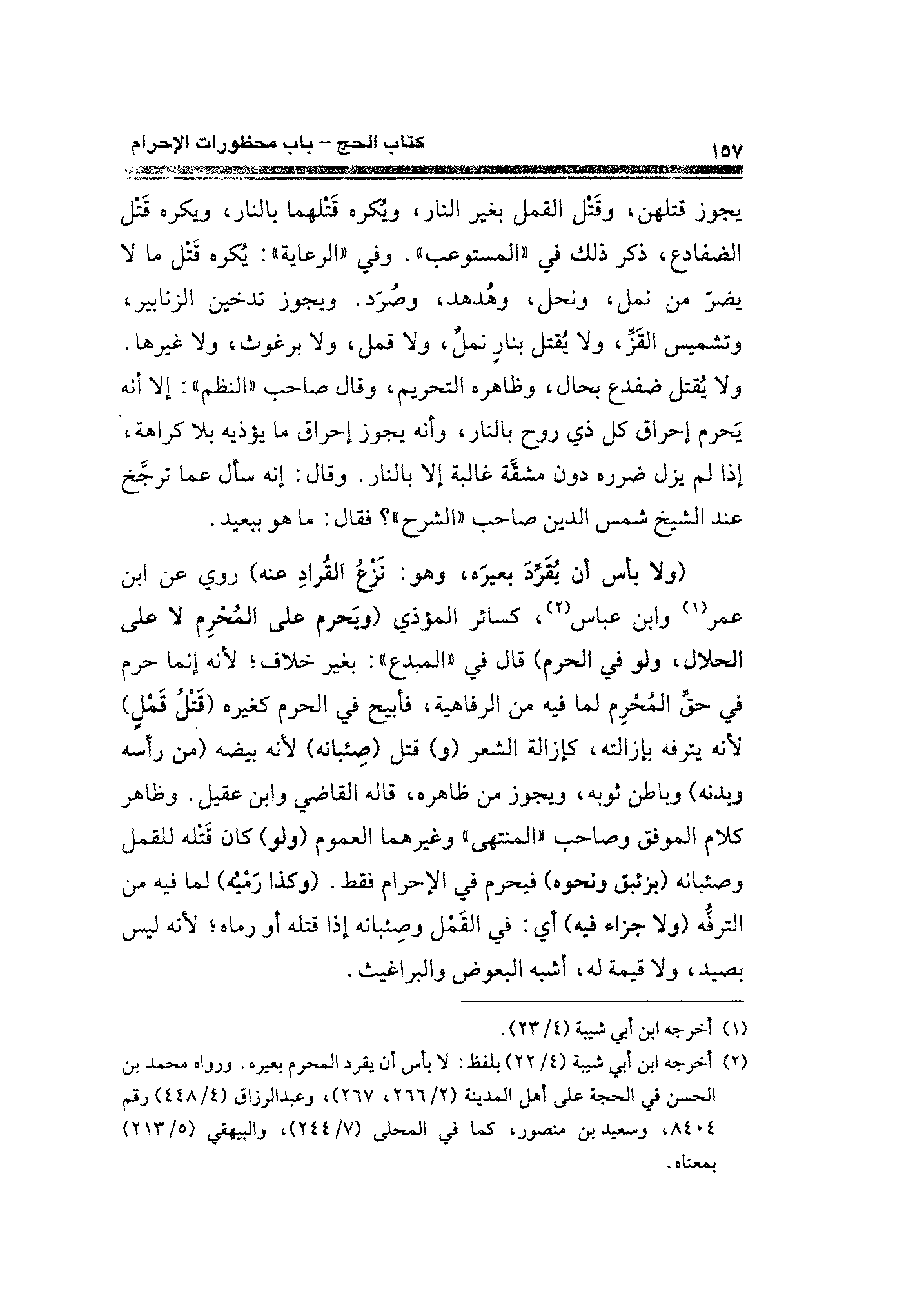 (¬٢) أخرجه ابن أبي شيبة (٤/ ٢٢) بلفظ: لا بأس أن يقرد المحرم بعيره. ورواه محمد بن الحسن في الحجة على أهل المدينة (٢/ ٢٦٦، ٢٦٧)، وعبد الرزاق (٤/ ٤٤٨) رقم ٨٤٠٤، وسعيد بن منصور، كما في المحلى (٧/ ٢٤٤)، والبيهقي (٥/ ٢١٣) بمعناه.