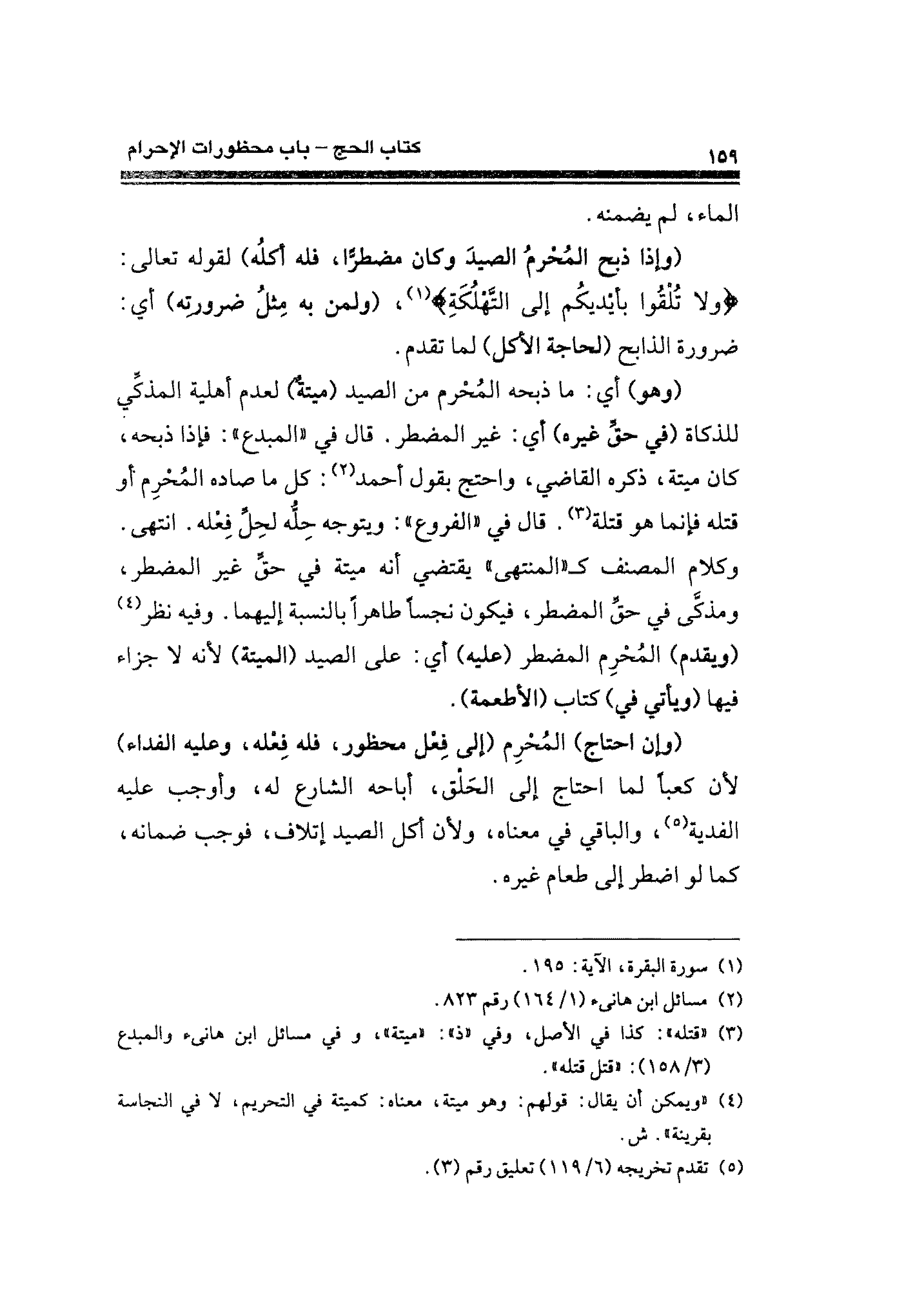 (وهو) أي: ما ذبحه المُحرم من الصيد (ميتةٌ) لعدم أهلية المذكي للذكاة (في حق غيره) أي: غير المضطر. قال في "المبدع": فإذا ذبحه، كان ميتة، ذكره القاضي، واحتج بقول أحمد (¬٢): كل ما صاده المحرم أو قتله فإنَّما هو قتلة (¬٣). قال في "الفروع": ويتوجه حِلُّه لحِلِّ فِعله. انتهى. وكلام المصنف كـ"المنتهى" يقتضي أنَّه ميتة في حق غير المضطر، ومذكى في حقِّ المضطر، فيكون نجسًا طاهرًا بالنسبة إليهما. وفيه نظرٌ (¬٤) (ويقدم) المحرم المضطر (عليه) أي: على الصيد (الميتة) لأنَّه لا جزاء فيها (ويأتي في) كتاب (الأطعمة).