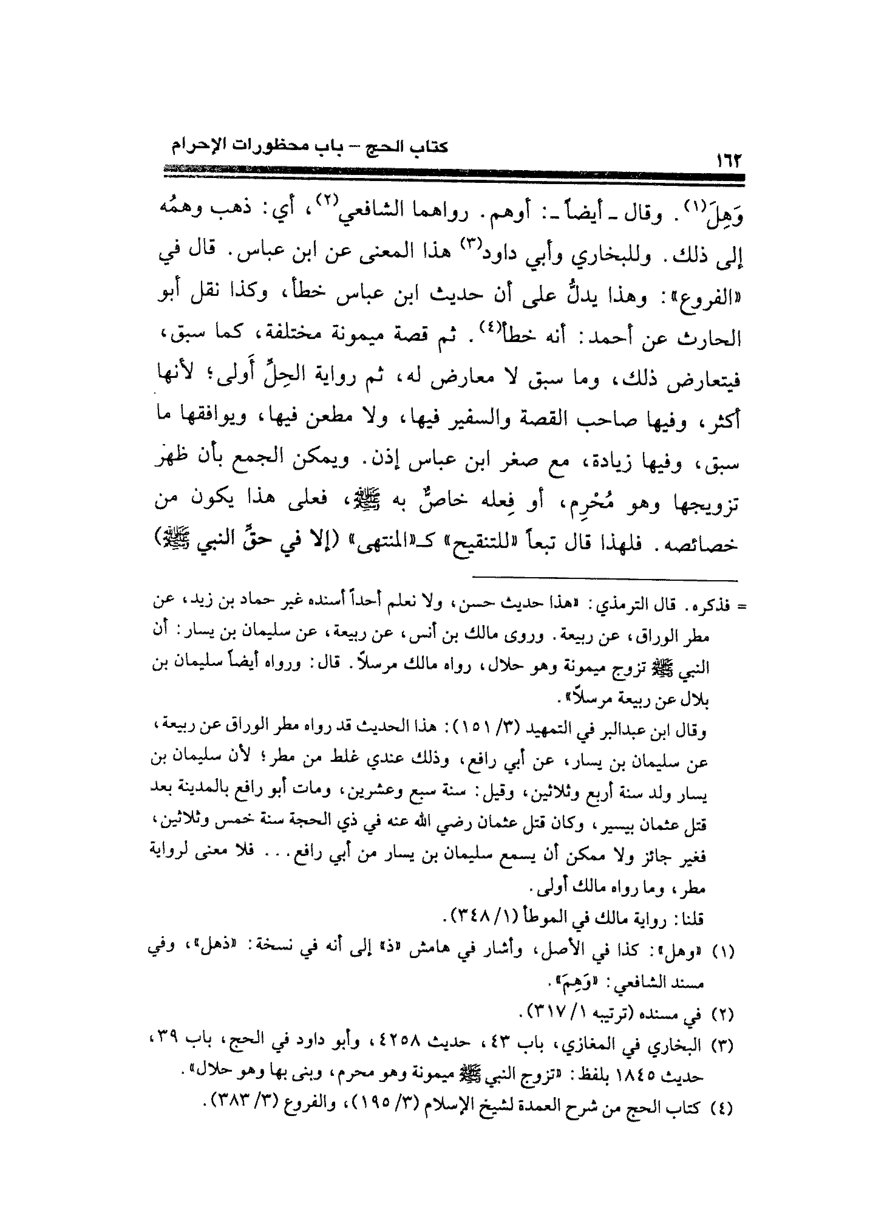 (¬٣) البخاري في المغازي، باب ٤٣، حديث ٤٢٥٨، وأبو داود في الحج، باب ٣٩، حديث ١٨٤٥ بلفظ: "تزوج النبي - صلى الله عليه وسلم - ميمونة وهو محرم، وبنى بها وهو حلال".