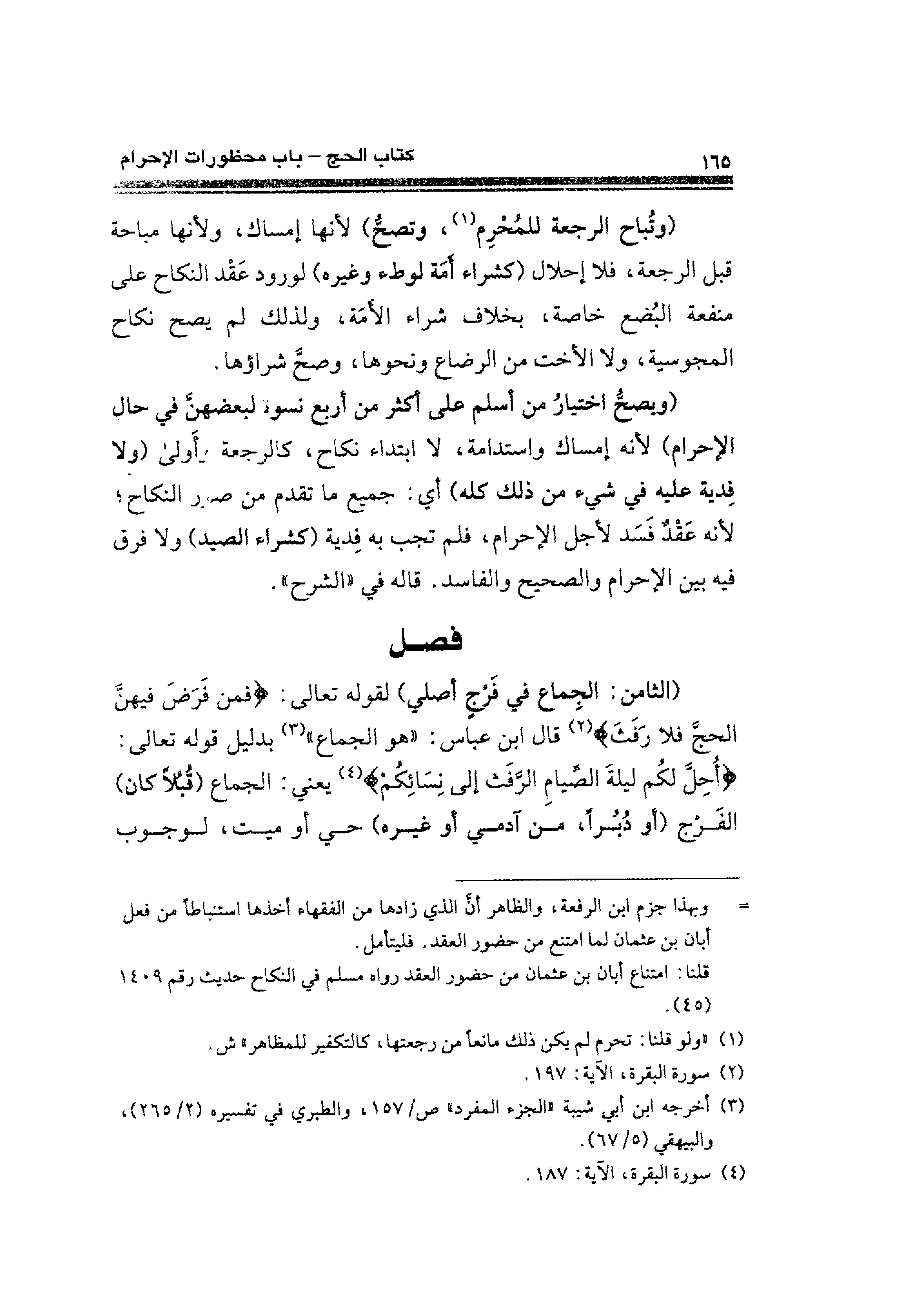 (وتُباح الرجعة للمُحْرِم (¬١)، وتصحُّ) لأنها إمساك، ولأنها مباحة قبل الرجعة، فلا إحلال (كشراء أمَة لوطء وغيره) لورود عَقْد النكاح على منفعة البُضع خاصة، بخلاف شراء الأمَة، ولذلك لم يصح نكاح المجوسية، ولا الأخت من الرضاع ونحوها، وصحَّ شراؤها.