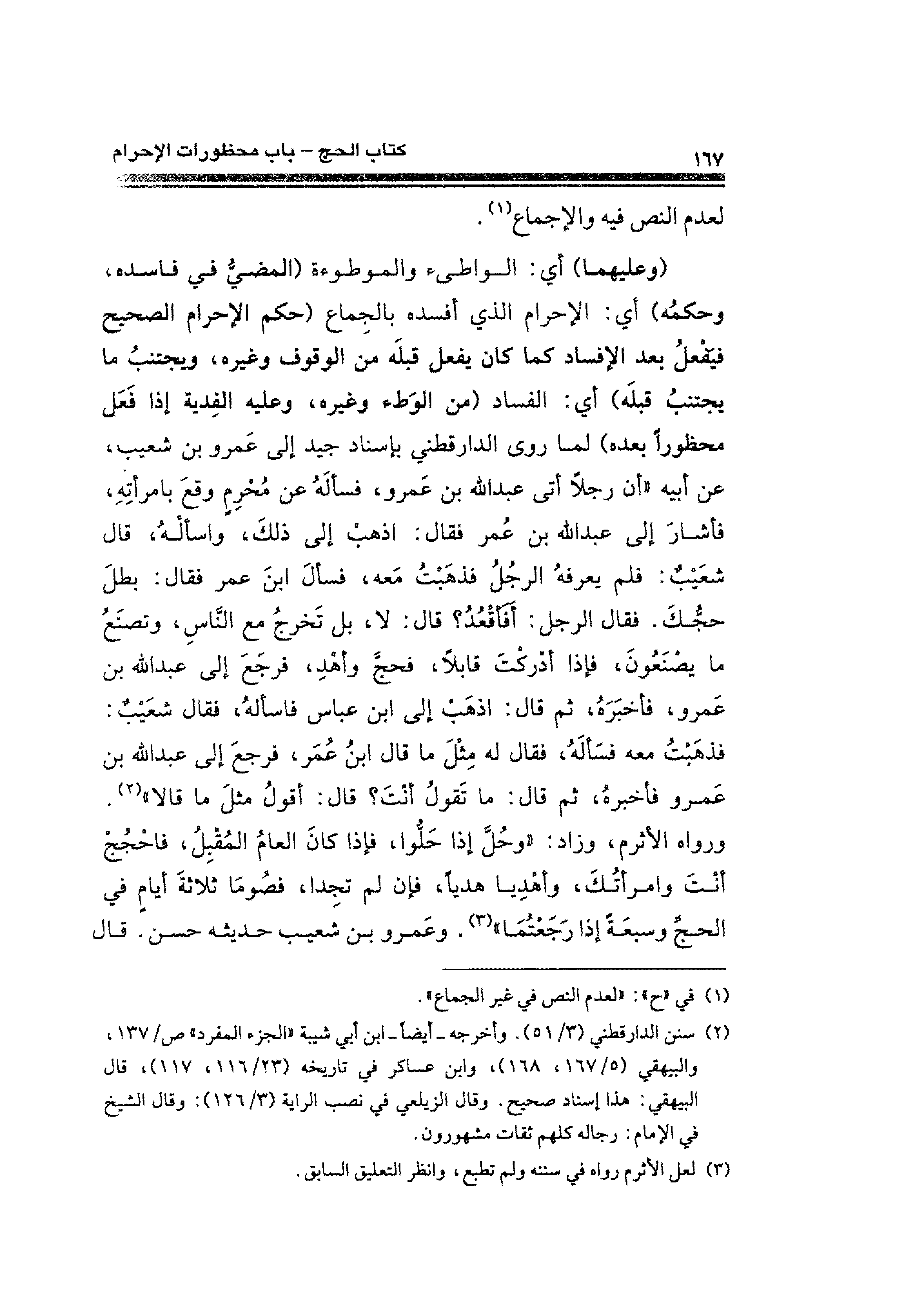 (وعليهما) أي: الواطئ والموطوءة (المضيُّ في فاسده، وحكمُه) أي: الإحرام الذي أفسده بالجِماع (حكم الإحرام الصحيح فيَفْعلُ بعد الإفساد كلما كان يفعل قبلَه من الوقوف وغيره، ويجتنبُ ما يجتنبُ قبلَه) أي: الفساد (من الوَطء وغيره،. وعليه الفِدية إذا فَعَل محظورًا بعده) لما روى الدارقطني بإسناد جَيد إلى عَمرو بن شعيب، عن أبيه "أن رجلًا أتى عبد الله بن عَمرو، فسألَهُ عن مُحْرِمٍ وقعَ بامرأتِهِ، فأشارَ إلى عبد الله بن عُمر فقال: اذهبْ إلى ذلكَ، واسألَهُ، قال شعَيبٌ: فلم يعرفهُ الرجُلُ فذهَبْتُ معه، فسألَ ابنَ عمر. فقال: بطلَ حجُّكَ. فقال الرجل: أفَأقْعُدُ؟ قال: لا، بل تَخرجُ مع النَّاسِ، وتصنَعُ ما يصْنَعُونَ، فإذا أدْركْتَ قابلًا، فحجَّ وأهْدِ، فرجَعَ إلى عبد الله بن عَمرو، فأخبَرَهُ، ثم قال: اذهَبْ إلى ابن عباس فاسألهُ، فقال شعَيبٌ: فذهَبْتُ معه فسَألَهُ، فقال له مِثْلَ ما قال ابنُ عُمَر، فرجعَ إلى عبد الله بن عَمرو فأخبرهُ، ثم قال: ما تَقولُ أنْتَ؟ قال: أقولُ مثلَ ما قالا" (¬٢). ورواه الأثرم، وزاد: "وحُلَّ إذا حَلُّوا، فإذا كانَ العامُ المُقْبِلُ، فاحْجُجُ أنْتَ وامرأتُكَ، وأهْدِيا هديًا، فإن لم تجِدا، فصُومَا ثلاثةَ أيامٍ في الحجِّ وسبعَةً إذا رَجَعْتُمَا" (¬٣). وعَمرو بن شعيب حديثه حسن. قال