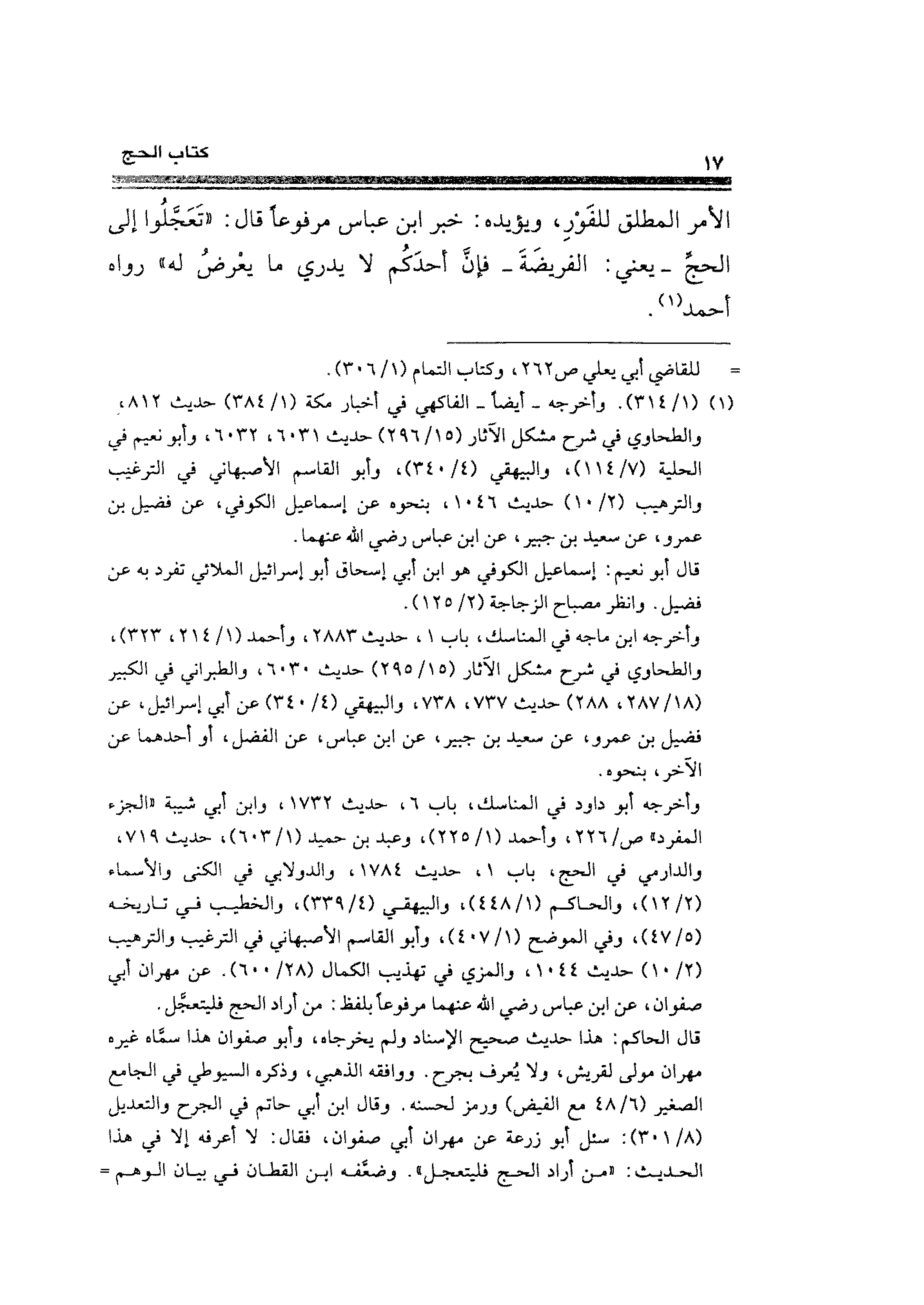 وأخرجه أبو داود في المناسك، باب ٦، حديث ١٧٣٢، وابن أبي شيبة "الجزء المفرد" ص / ٢٢٦، وأحمد (١/ ٢٢٥)، وعبد بن حميد (١/ ٦٠٣)، حديث ٧١٩، والدارمي في الحج، باب ١، حديث ١٧٨٤، والدولابي في الكنى والأسماء (٢/ ١٢)، والحكم (١/ ٤٤٨)، والبيهقي (٤/ ٣٣٩)، والخطيب في تاريخه (٥/ ٤٧)، وفي الموضح (١/ ٤٠٧)، وأبو القاسم الأصبهاني في الترغيب والترهيب (٢/ ١٠) حديث ١٠٤٤، والمزي في تهذيب الكمال (٢٨/ ٦٠٠). عن مهران أبي صفوان، عن ابن عباس رضي الله عنهما مرفرعًا بلفظ: من أراد الحج فليتعجَّل.