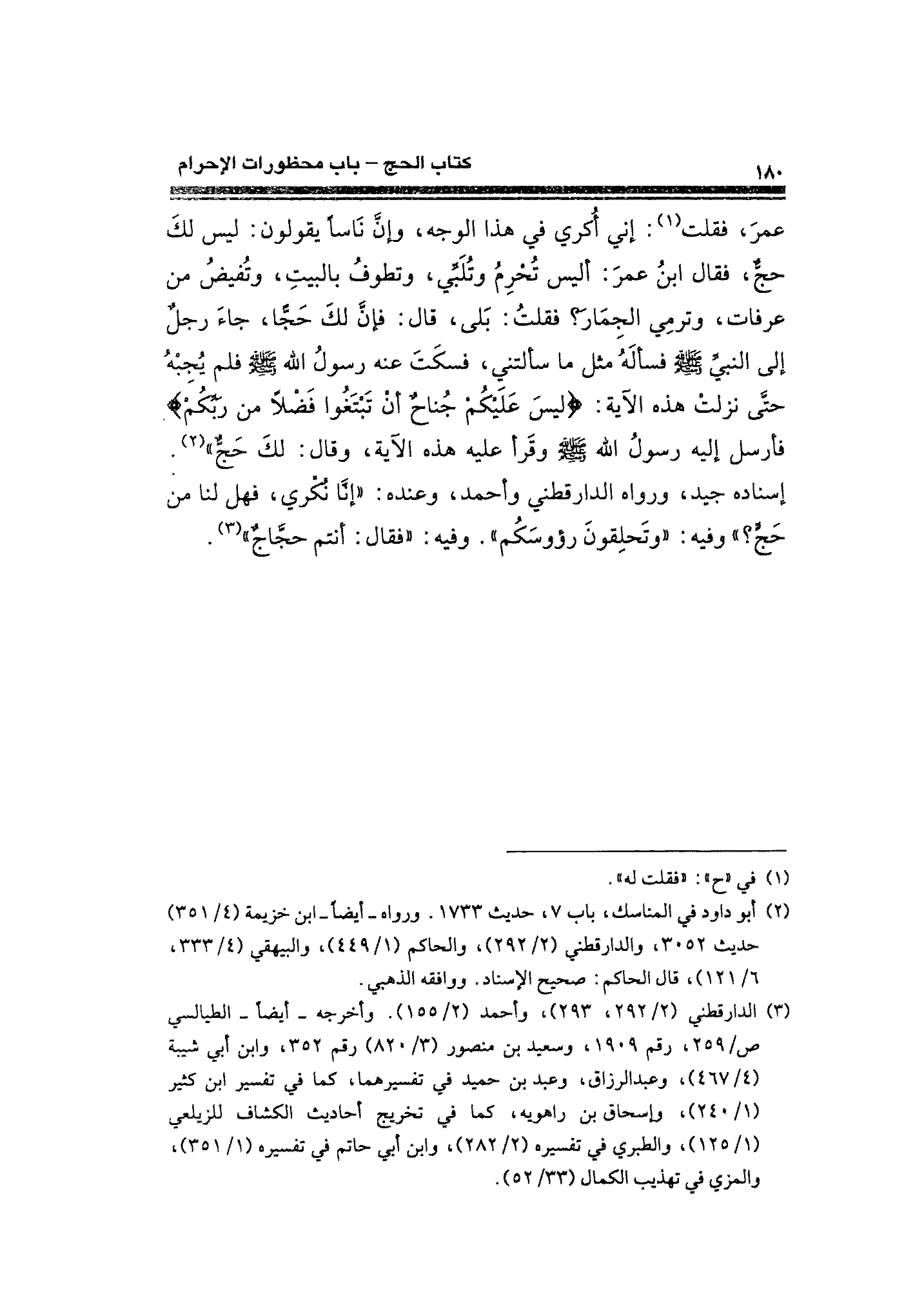 عمرَ، فقلت (¬١): إني أُكري في هذا الوجه، وإنَّ نَاسًا يقولون: ليس لكَ حجٌّ، فقال ابنُ عمرَ: أليس تُحْرِمُ وتُلَبِّي، وتطوفُ بالبيتِ، وتُفيضُ من عرفات، وترمِي الجمَارَ؟ فقلتُ: بَلى، قال: فإنَّ لكَ حَجًّا، جاءَ رجلٌ إلى النبي - صلى الله عليه وسلم - فسألَهُ مثل ماسألتني، فسكَتَ عنه رسول الله فلم يُجِبْهُ حتَّى نزلتْ هذه الآية: {لَيسَ عَلَيكُمْ جُنَاحٌ أَنْ تَبْتَغُوا فَضْلًا مِنْ رَبِّكُمْ} فأرسل إليه رسول الله - صلى الله عليه وسلم - وقَرأ عليه هذه الآية، وقال: لكَ حَجٌّ" (¬٢). إسناده جيد، ورواه الدارقطني وأحمد، وعنده: "إنَّا نُكْري، فهل لنا من حَجٍّ؟ " وفيه: "وتَحلِقونَ رؤوسَكُم". وفيه: "فقال: أنتم حجَّاجٌ" (¬٣).