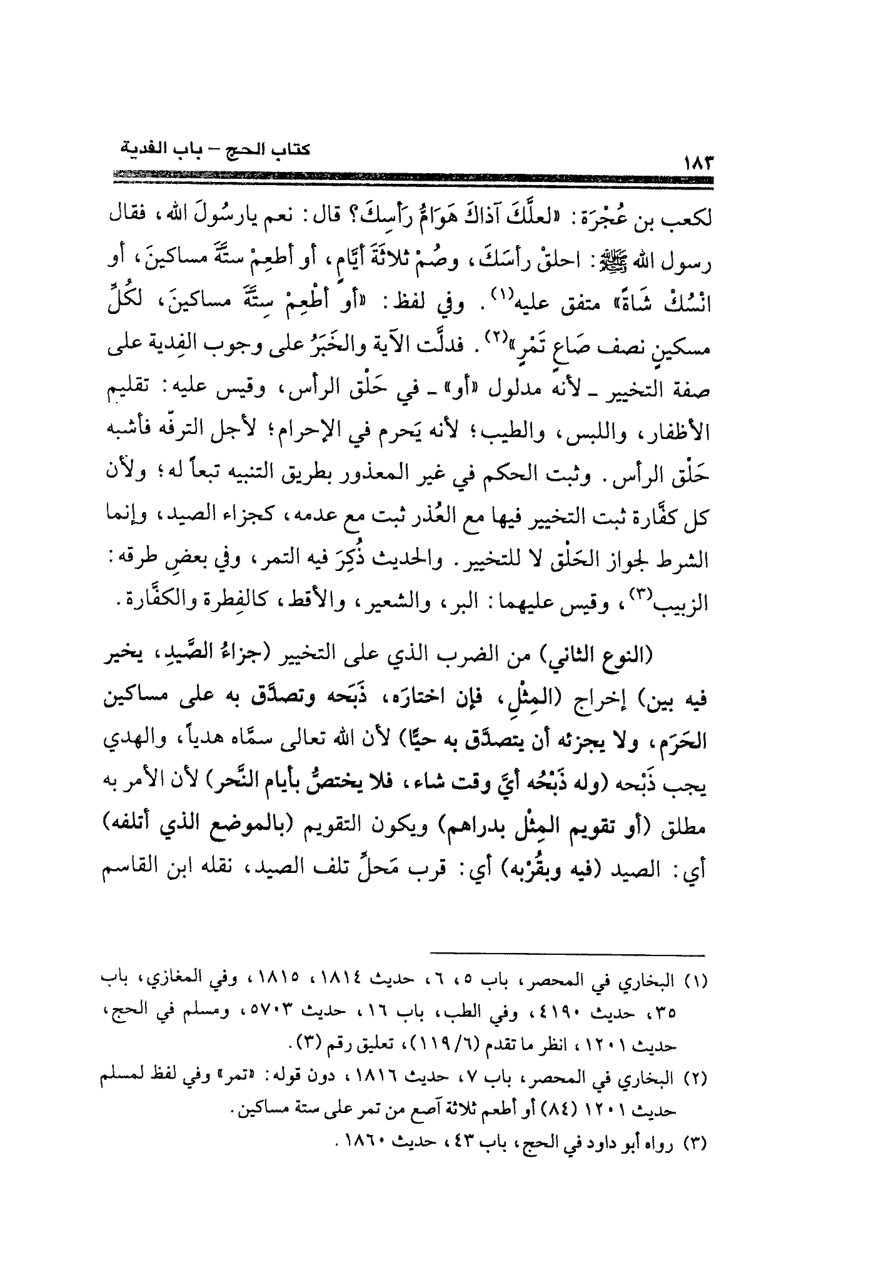 (¬٢) البخاري في المحصر، باب ٧، حديث ١٨١٦، دون قوله: "تمر" وفي لفظ لمسلم حديث ١٢٠١ (٨٤) أو أطعم ثلاثة آصع من تمر على ستة مساكين.
