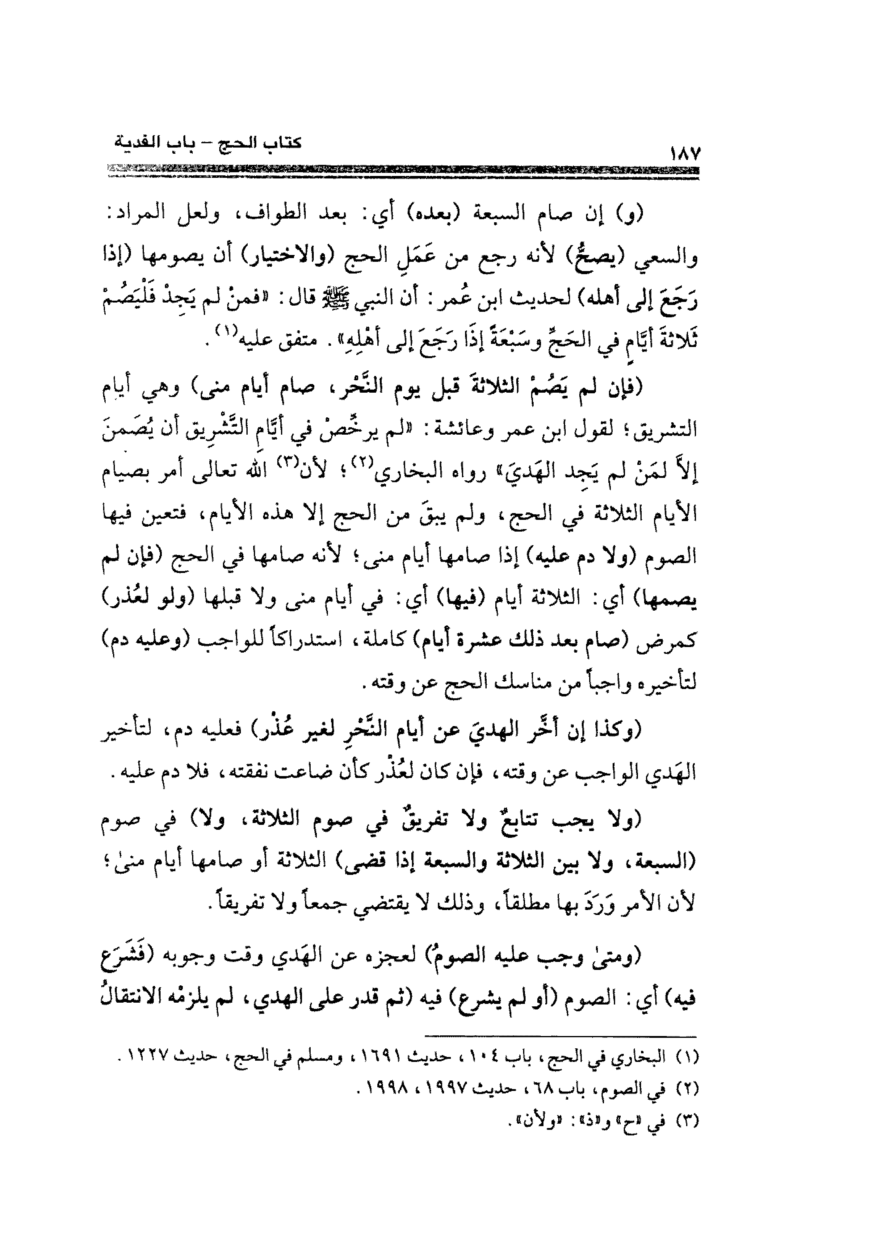 (و) إن صام السبعة (بعده) أي: بعد الطواف، ولعل المراد: والسعي (يصحُّ) لأنه رجع من عَمَلِ الحج (والاختيار) أن يصومها (إذا رَجَعَ إلى أهله) لحديث ابن عُمر: أن النبي - صلى الله عليه وسلم - قال: "فمنْ لم يَجِدْ فَلْيَصُم ثَلاثةَ أيامِ في الحجِّ وسَبْعَةً إذَا رَجَعَ إلى أهلِهِ". متفق عليه (¬١).