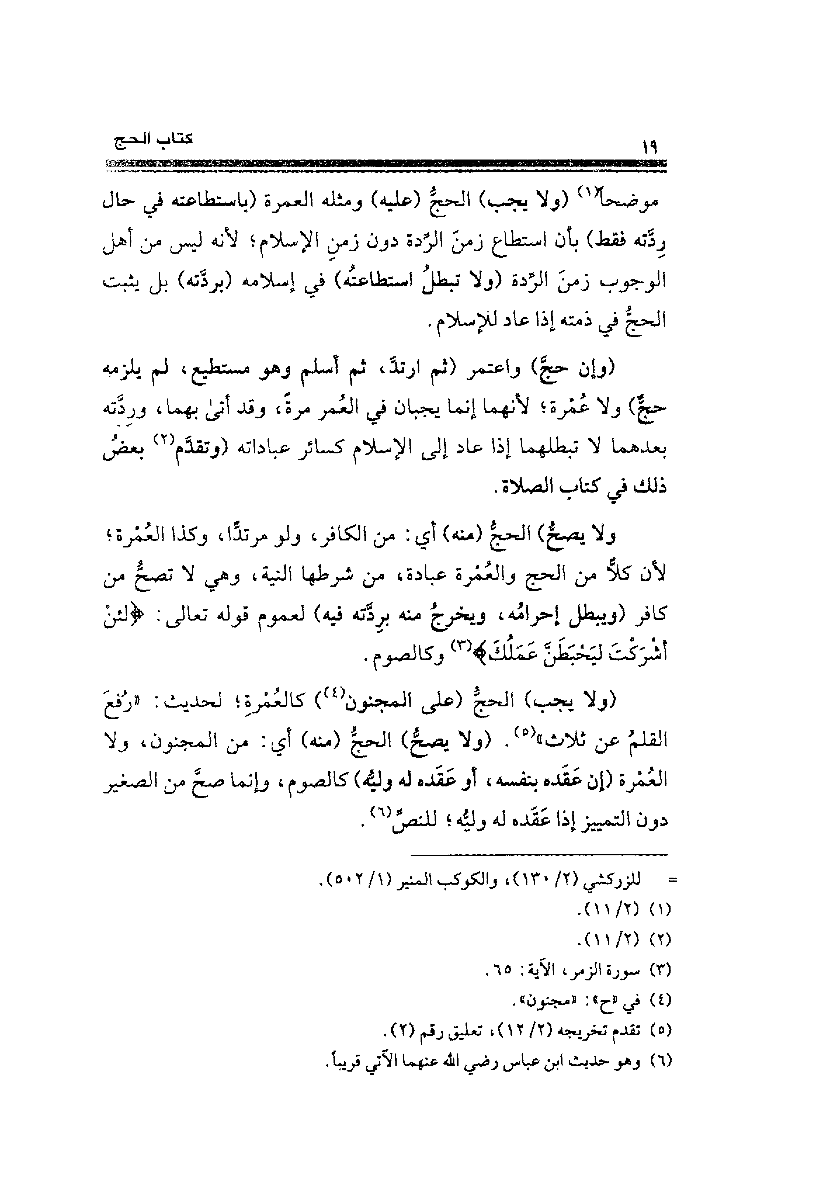 موضحًا (¬١) (ولا يجب) الحجُّ (عليه) ومثله العمرة (باستطاعته في حال رِدَّته فقط) بأن استطاع زمنَ الرِّدة دون زمنِ الإسلام؛ لأنه ليس من أهل الوجوب زمنَ الرِّدة (ولا تبطلُ استطاعتُه) في إسلامه (بردَّته) بل يثبت الحجُّ في ذمته إذا عاد للإسلام.