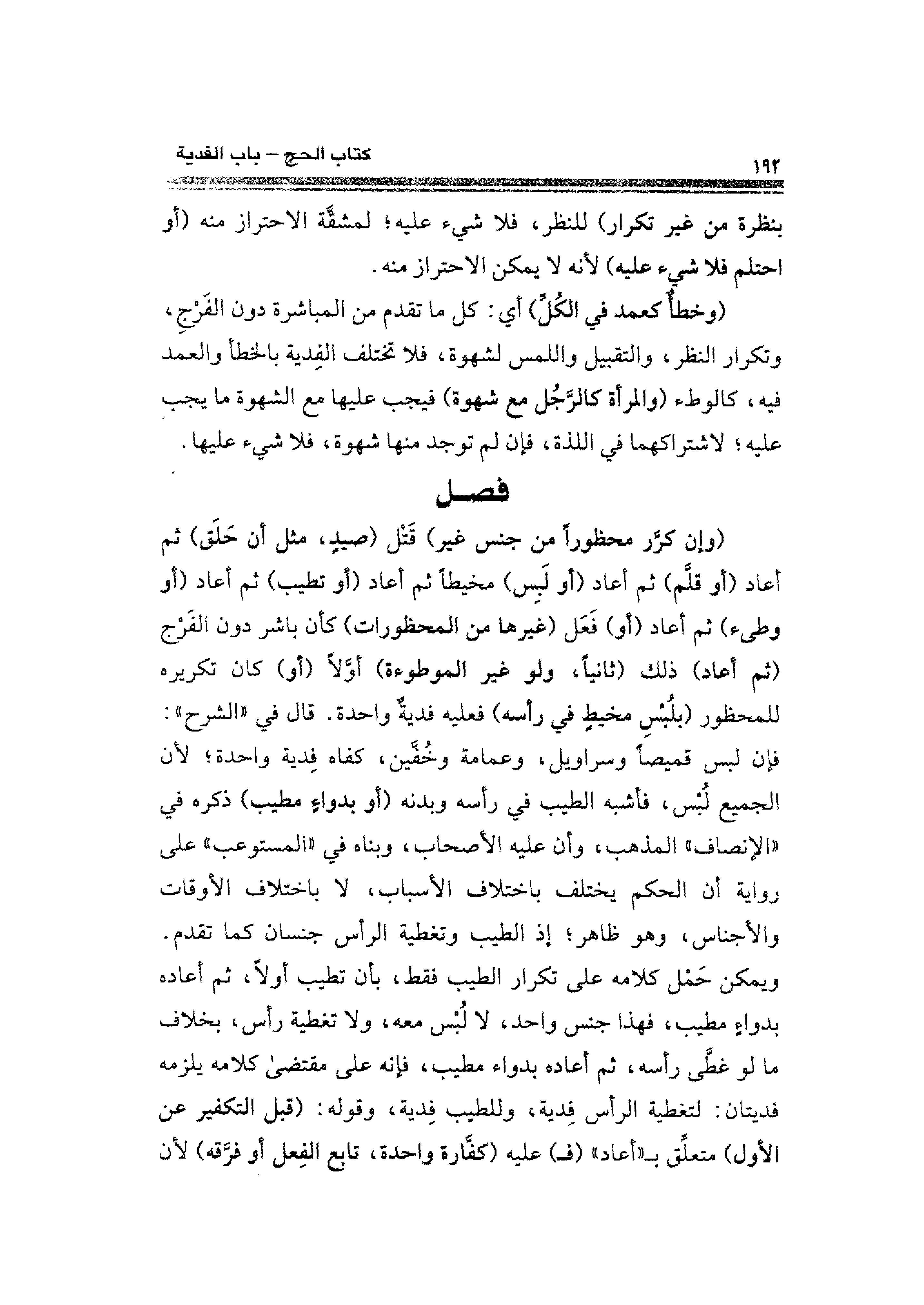 (وإن كرَّر محظورًا من جنس غير) قَتْل (صيدٍ، مثل أن حَلَق) ثم أعاد (أو قلَّم) ثم أعاد (أو لَبِس) مخيطًا ثم أعاد (أو تطيب) ثم أعاد (أو وطئ) ثم أعاد (أو) فَعَل (غيرها من المحظورات) كأن باشر دون الفَرْج (ثم أعاد) ذلك (ثانيًا، ولو غير الموطوءة) أوَّلًا (أو) كان تكريره للمحظور (بلُبْسِ مخيطٍ في رأسه) فعليه فديةٌ واحدة. قال في "الشرح": فإن لبس قميصًا وسراويل، وعمامة وخُفَّين، كفاه فِدية واحدة؛ لأن الجميع لُبْس، فأشبه الطيب في رأسه وبدنه (أو بدواءٍ مطيب) ذكره في "الإنصاف" المذهب، وأن عليه الأصحاب، وبناه في "المستوعب" على رواية أن الحكم يختلف باختلاف الأسباب، لا باختلاف الأوقات والأجناس، وهو ظاهر؛ إذ الطيب وتغطية الرأس جنسان كما تقدم. ويمكن حَمْل كلامه على تكرار الطيب فقط، بأن تطيب أولًا، ثم أعاده بدواءٍ مطيب، فهذا جنس واحد، لا لُبْس معه، ولا تغطية رأس، بخلاف ما لو غطَّى رأسه، ثم أعاده بدواء مطيب، فإنه على مقتضى كلامه يلزمه فديتان: لتغطية الرأس فِدية، وللطيب فِدية، وقوله: (قبل التكفير عن الأول) متعلِّق بـ "أعاد" (فـ) عليه (كفَّارة واحدة، تابع الفِعل أو فرَّقه) لأن