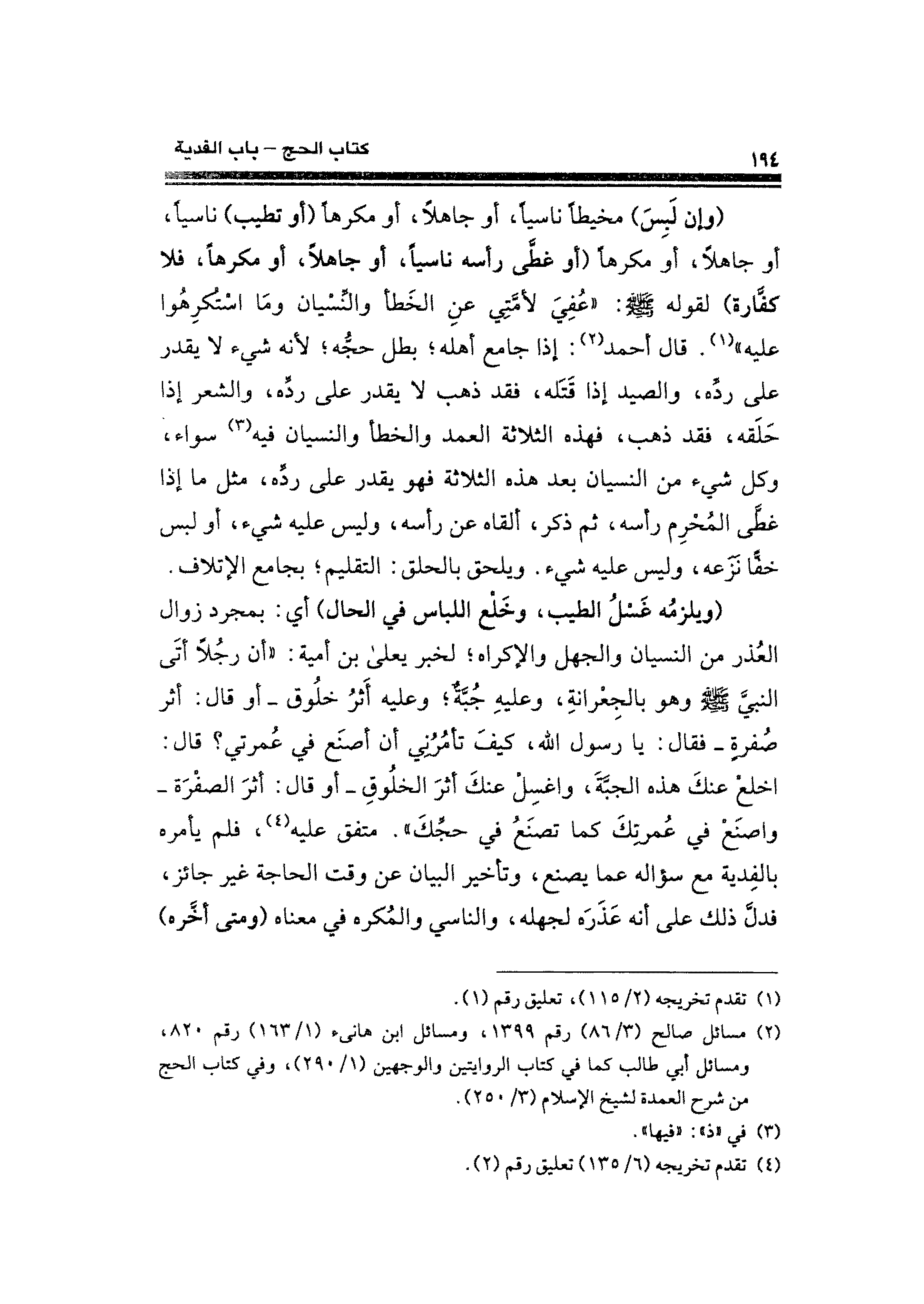 (ويلزمُه غَسْلُ الطيب، وخَلْع اللباس في الحال) أي: بمجرد زوال العُذر من النسيان والجهل والإكراه؛ لخبر بعلي بن أمية: "أن رجُلًا أتَى النبيَّ - صلى الله عليه وسلم - وهو بالجِعْرانةِ، وعليهِ جُبَّةٌ، وعليه أَثرُ خلُوق -أو قال: أثر صُفرةٍ- فقال: يا رسول الله، كيفَ تأمُرُنِي أن أصنَع في عُمرتي؟ قال: اخلعْ عنكَ هذه الجبَّةَ، واغسِلْ عنكَ أثرَ الخلُوقِ -أو قال: أثرَ الصفْرَة- واصنَعْ في عُمرتِكَ كما تصنَعُ في حجِّكَ". متفق عليه (¬٤)، فلم يأمره بالفِدية مع سؤاله عما يصنع، وتأخير البيان عن وقت الحاجة غير جائز، فدلَّ ذلك على أنه عَذَرَه لجهله، والناسي والمُكره في معناه (ومتى أخَّره)