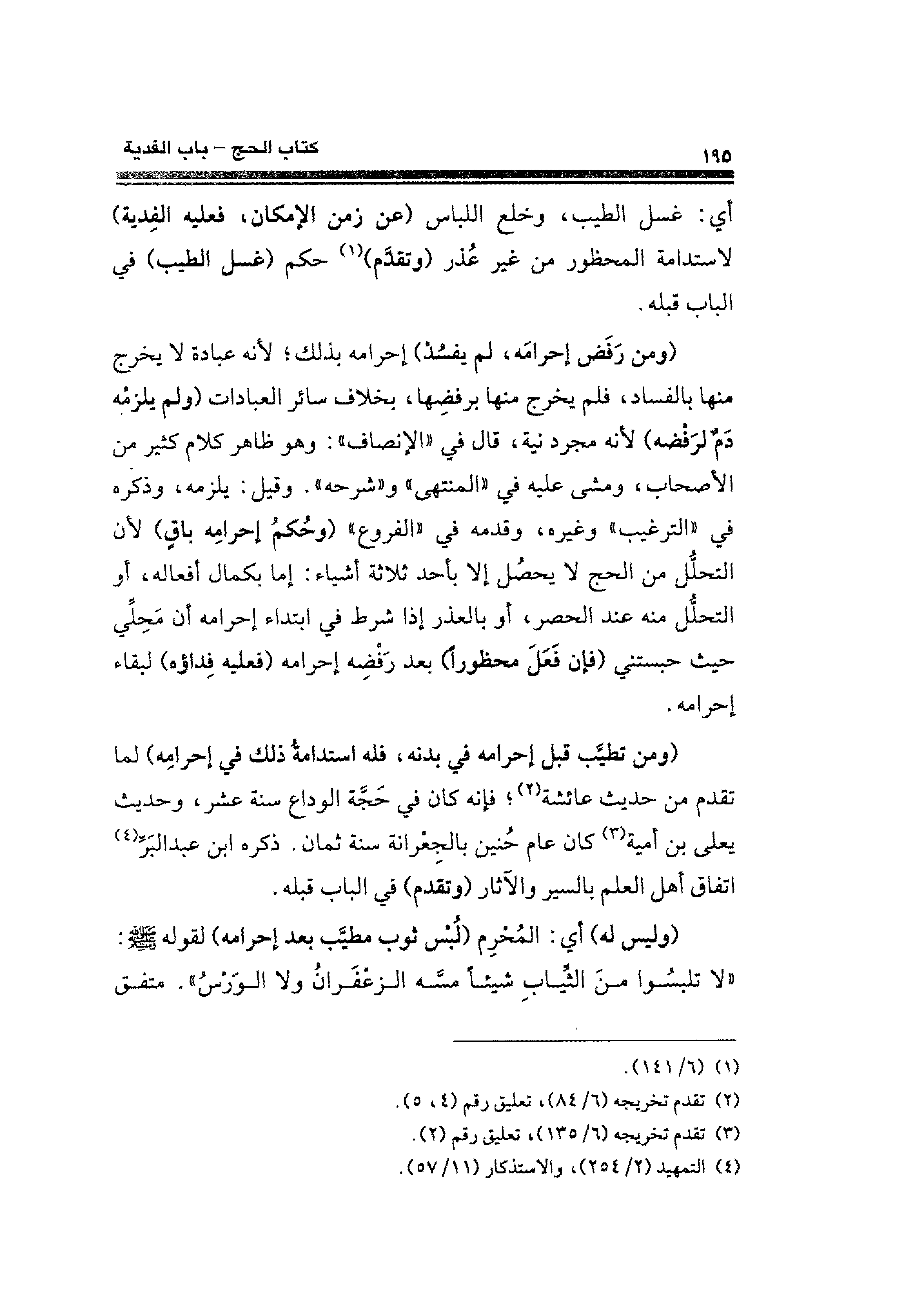 (ومن تطيَّب قبل احرامه في بدنه، فله استدامةُ ذلك في إحرامِه) لما تقدم من حديث عائشة (¬٢)؛ فإنه كان في حَجَّة الوداع سنة عشر، وحديث يعلى بن أمية (¬٣) كان عام حُنين بالجِعْرانة سنة ثمان. ذكره ابن عبد البَرِّ (¬٤) اتفاق أهل العلم بالسير والآثار (وتقدم) في الباب قبله.