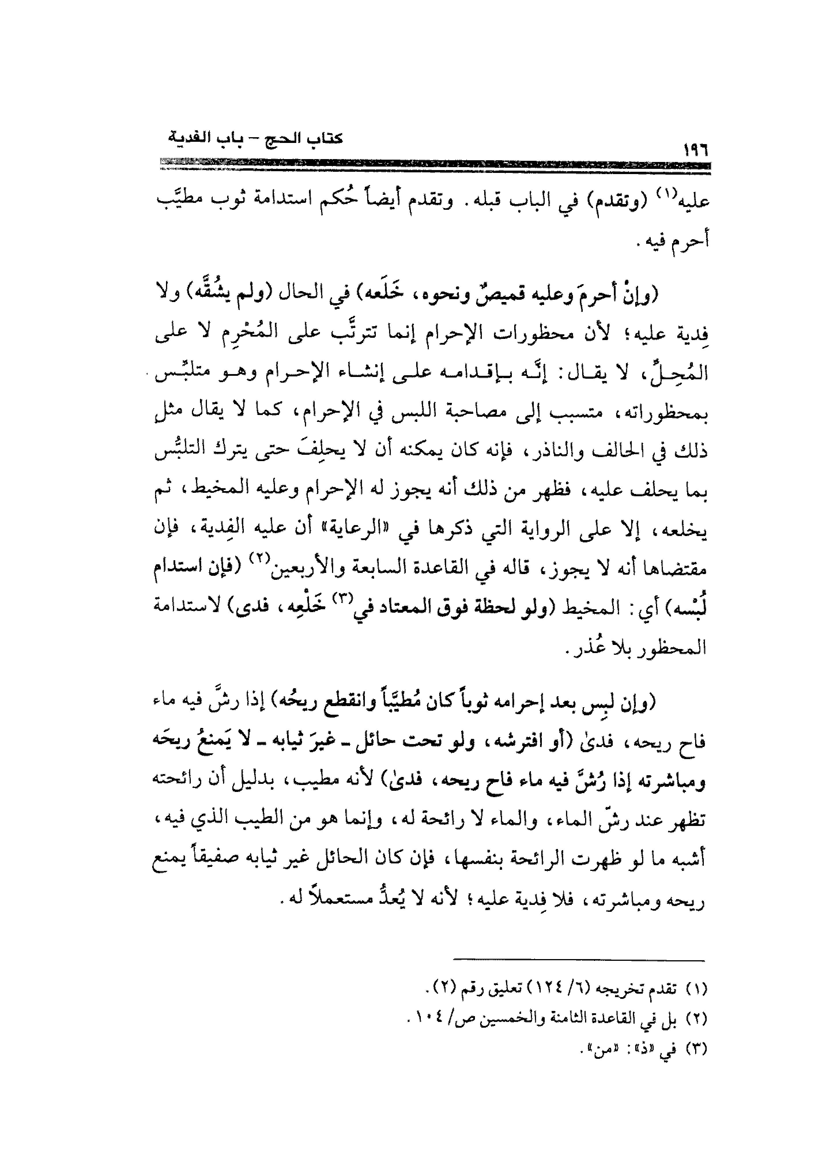 عليه (¬١) (وتقدم) في الباب قبله. وتقدم أيضًا حُكم استدامة ثوب مطيَّب أحرم فيه.