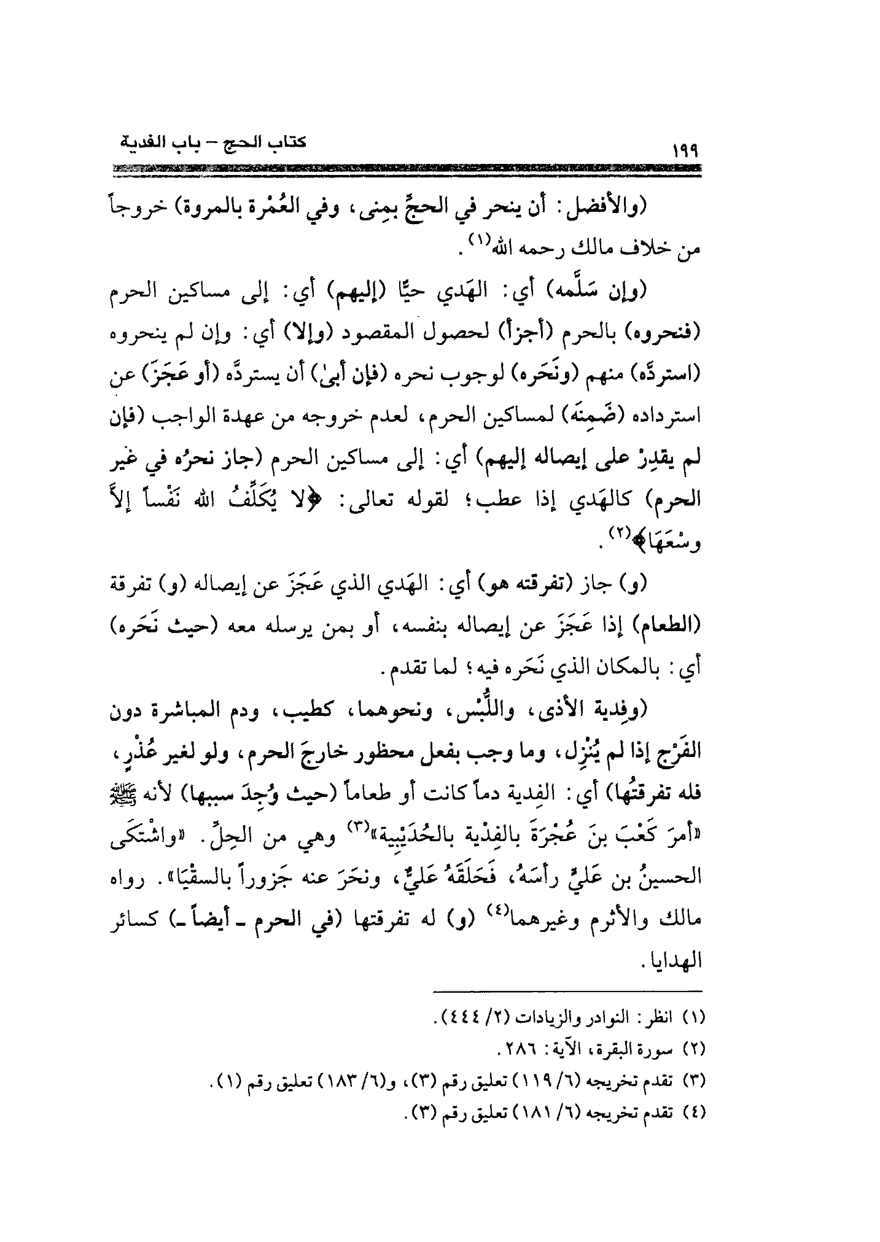 (وإن سَلَّمه) أي: الهَدي حيًّا (إليهم) أي: إلى مساكين الحرم (فنحروه) بالحرم (أجزأ) لحصول المقصود (وإلا) أي: وإن لم ينحروه (استردَّه) منهم (ونَحَره) لوجوب نحره (فإن أبى) أن يستردَّه (أو عَجَزَ) عن استرداده (ضَمِنَه) لمساكين الحرم، لعدم خروجه عن عهدة الواجب (فإن لم يقدِرْ على إيصاله إليهم) أي: إلى مساكين الحرم (جاز نحرُه في غير الحرم) كالهَدي إذا عطب؛ لقوله تعالى: {لَا يُكَلِّفُ اللَّهُ نَفْسًا إلا وُسْعَهَا} (¬٢).