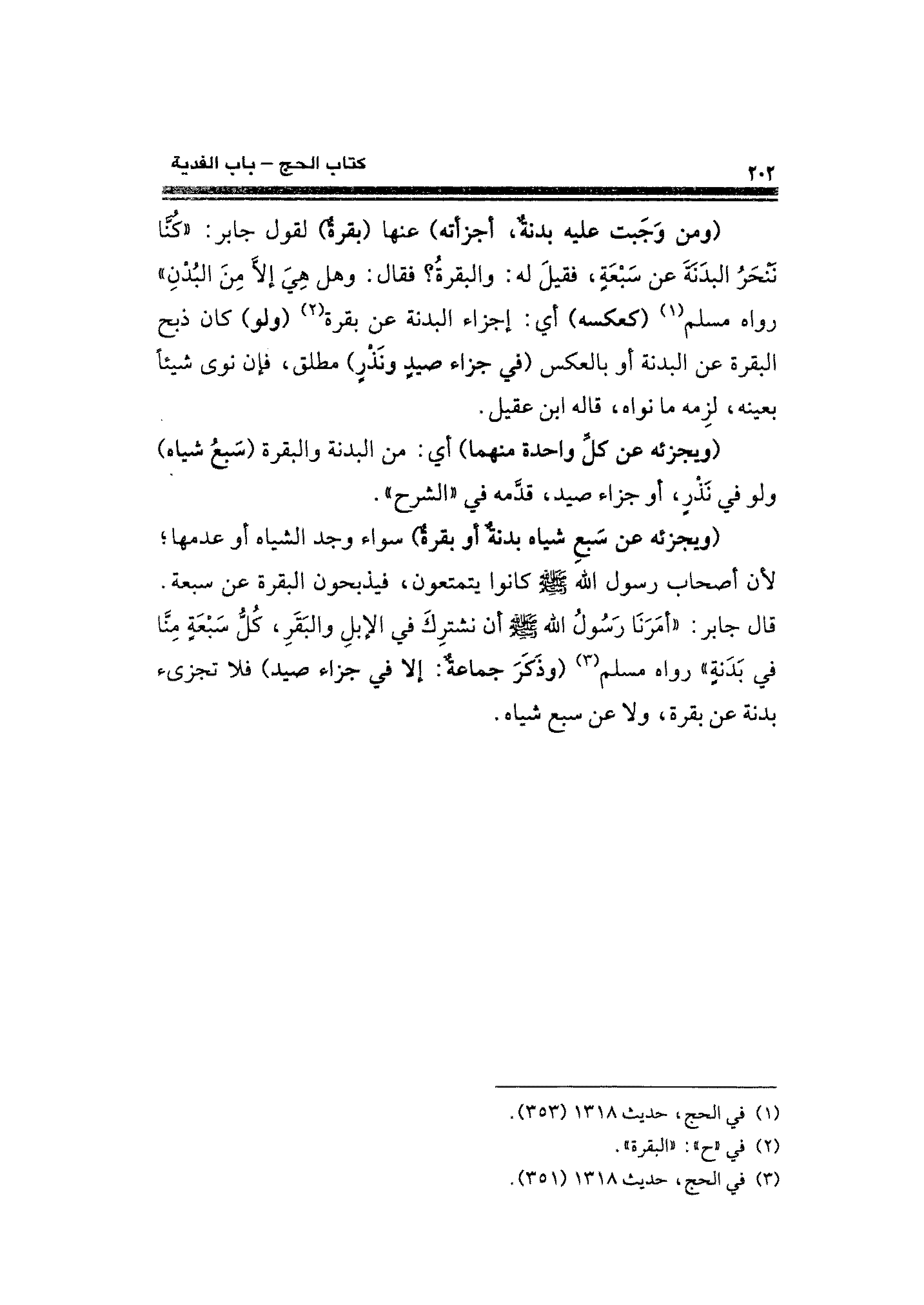 (ويجزئه عن سَبعِ شياه بدنةٌ أو بقرة) سواء وجد الشياه أو عدمها؛ لأن أصحاب رسول الله - صلى الله عليه وسلم - كانوا يتمتعون، فيذبحون البقرة عن سبعة. قال جابر: "أمَرَنَا رَسولُ الله - صلى الله عليه وسلم - أن نشترِكَ في الإبلِ والبقرِ، كل سَبعَة مِنا في بدَنةٍ" رواه مسلم (¬٣) (وذَكرَ جماعة: إلا في جزاء صيد) فلا تجزئ بدنة عن بقرة، ولا عن سبع شياه.