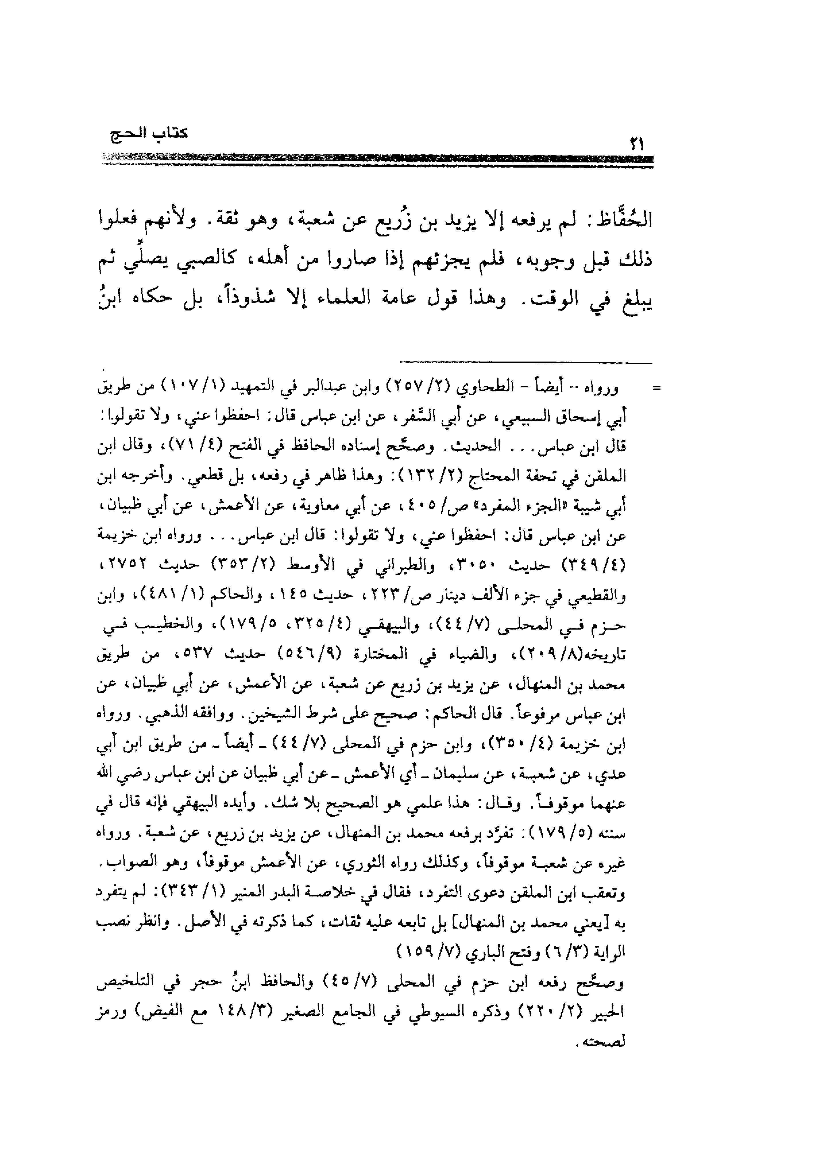 الحُفَّاظ: لم يرفعه إلا يزيد بن زُريع عن شعبة، وهو ثقة. ولأنهم فعلوا ذلك قبل وجوبه، فلم يجزئهم إذا صاروا من أهله، كالصبي يصلّي ثم يبلغ في الوقت. وهذا قول عامة العلماء إلا شذوذًا، بل حكاه ابنُ