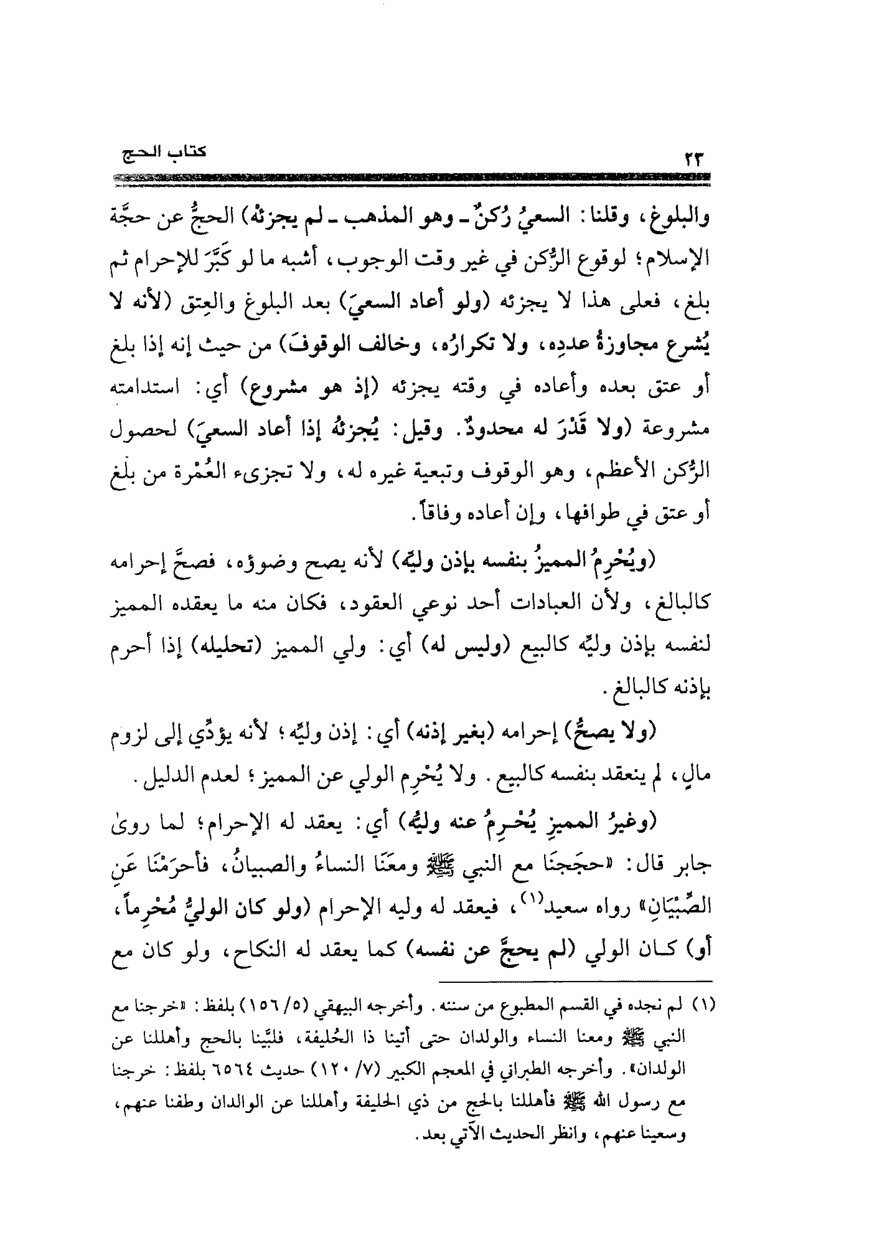 (ولا يصحُّ) إحرامه (بغير إذنه) أي: إذن وليِّه؛ لأنه يؤدِّي إلى لزوم مالٍ، لم ينعقد بنفسه كالبيع. ولا يُحْرِم الولي عن المميز؛ لعدم الدليل.