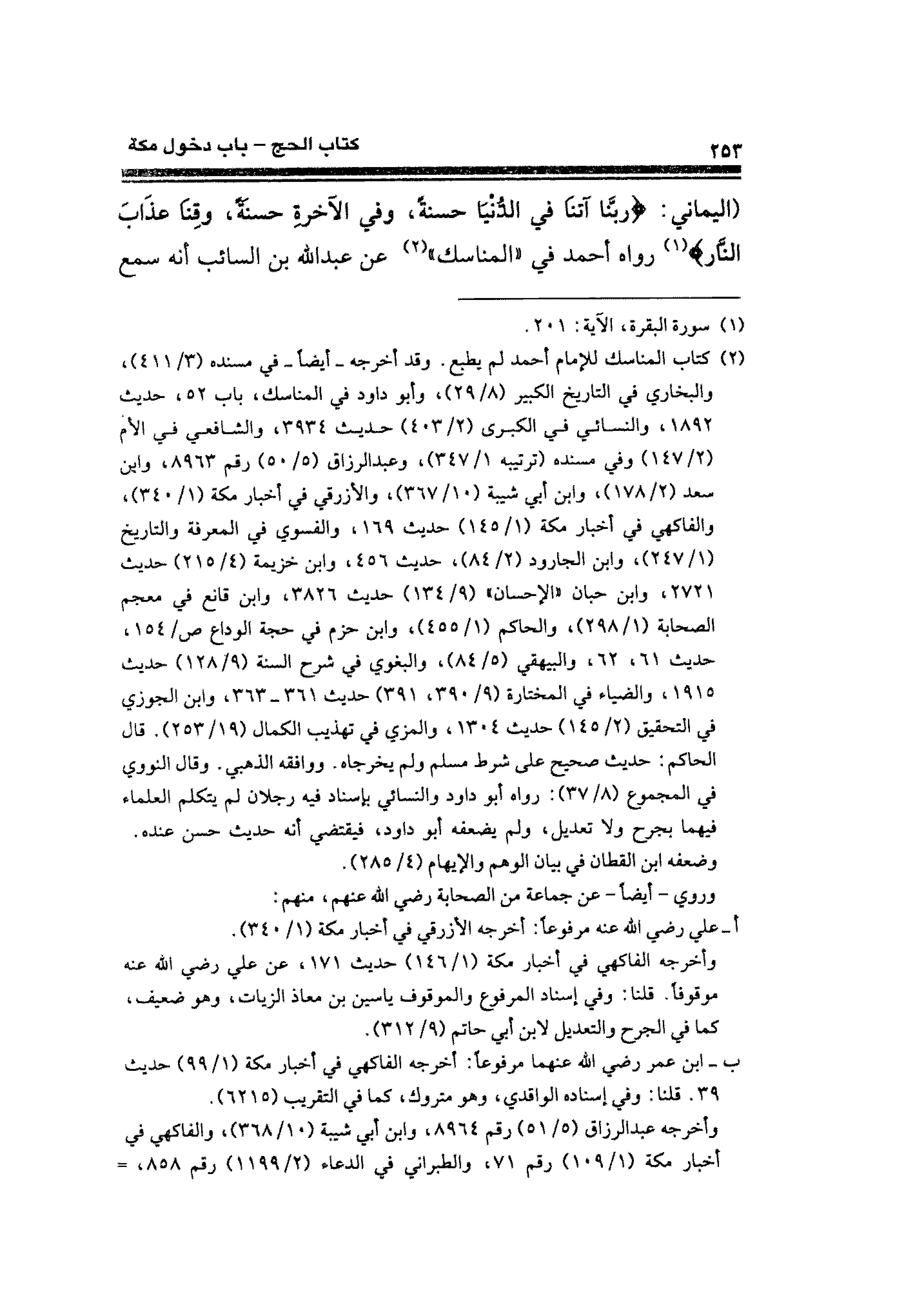 (اليماني: {رَبَّنَا آتِنَا فِي الدُّنْيَا حَسَنَةً وَفِي الْآخِرَةِ حَسَنَةً وَقِنَا عَذَابَ النَّارِ} (¬١) رواه أحمد في "المناسك" (¬٢) عن عبد الله بن السائب أنه سمع