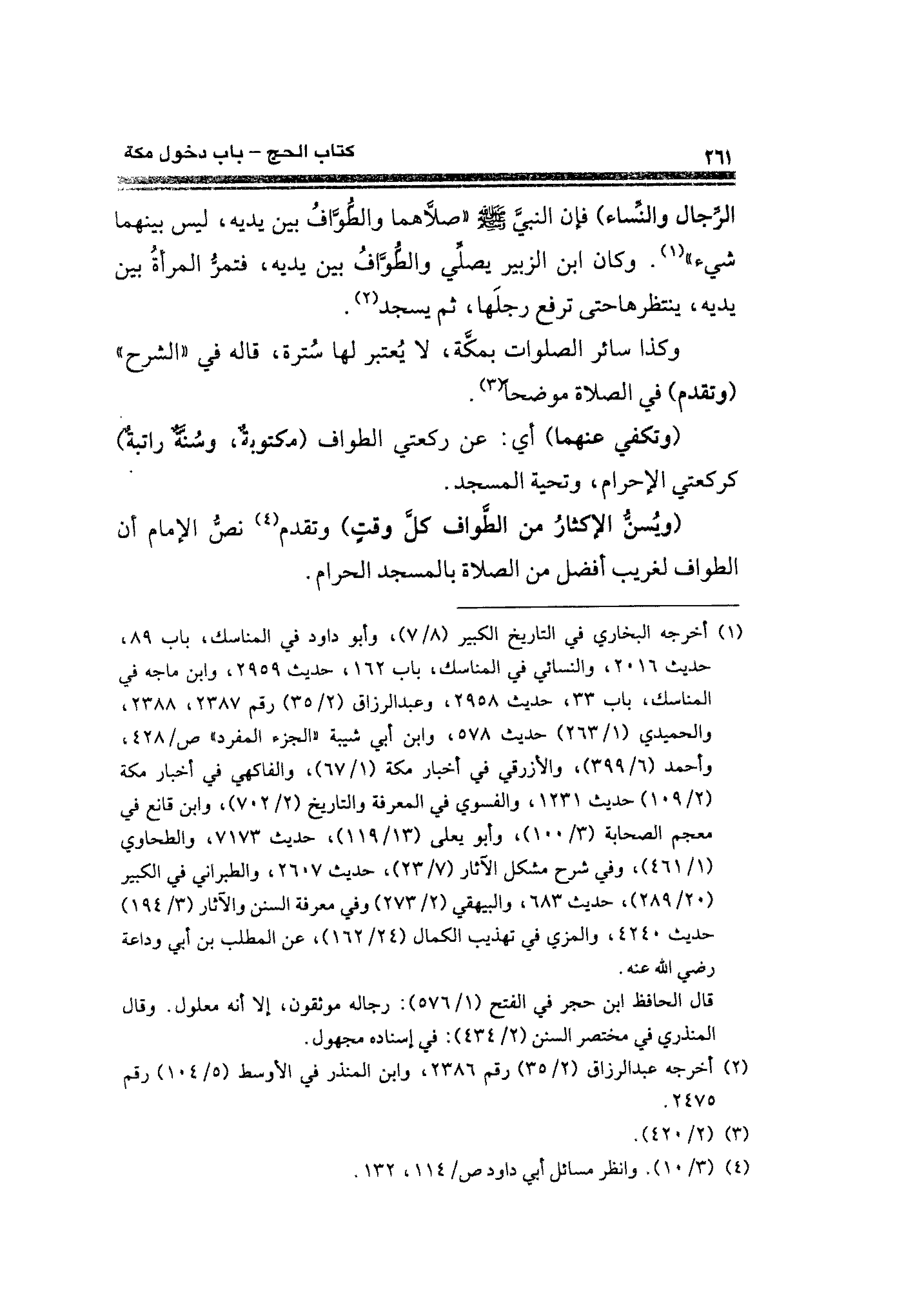 الرجال والنِّساء) فإن النبيَّ - صلى الله عليه وسلم - "صلَاّهما والطوّاف بين يديه، ليس بينهما شيء" (¬١). وكان ابن الزبير يصلِّي والطُّوَّاف بين - يديه، فتمرُّ المرأةُ بين يديه، ينتظرها حتى ترفع رجلَها، ثم يسجد (¬٢).