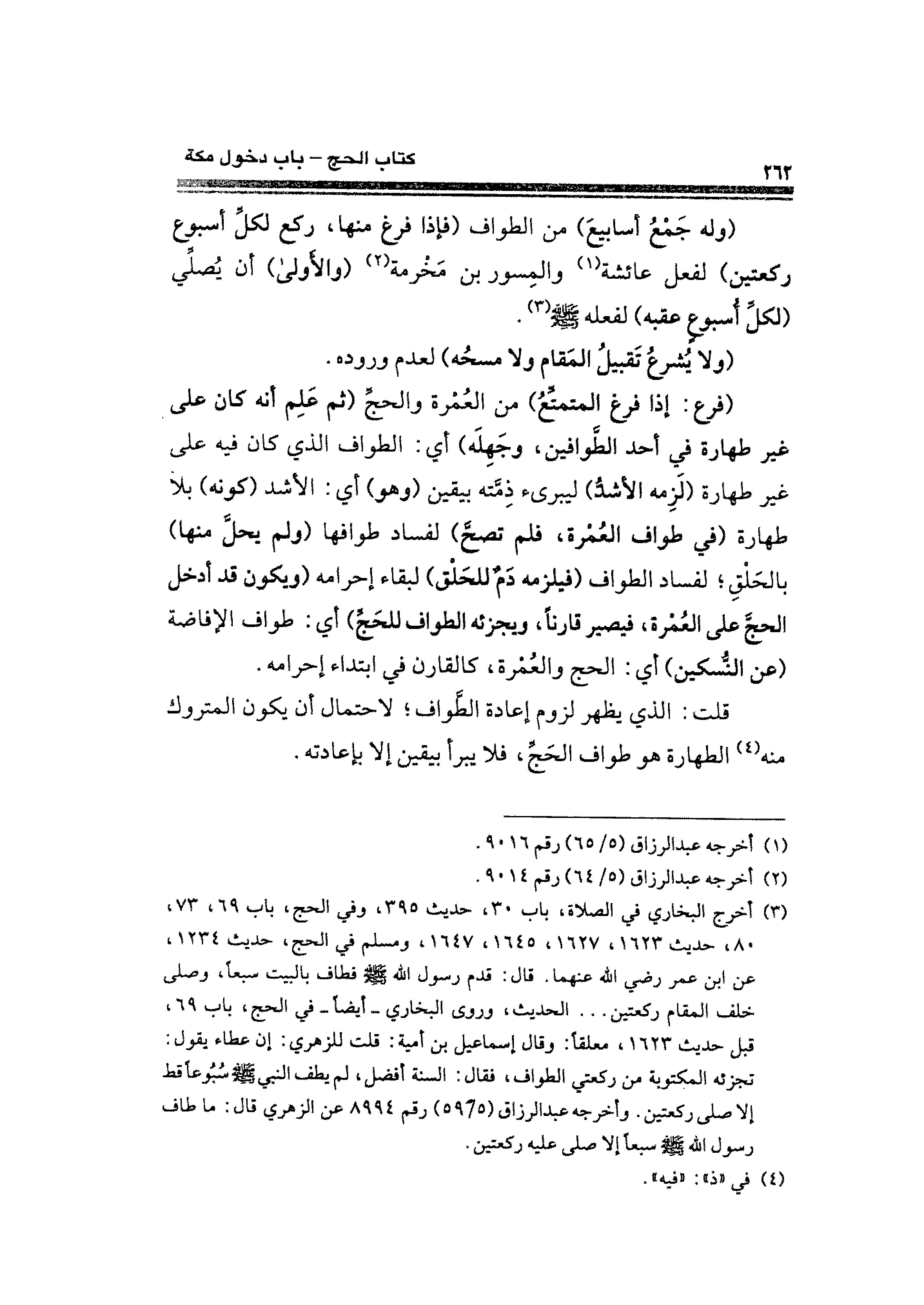 (¬٣) أخرج البخاري في الصلاة، باب ٣٠، حديث ٣٩٥، وفي الحج، باب ٦٩، ٧٣، ٨٠) حديث ١٦٢٣، ١٦٢٧، ١٦٤٥، ١٦٤٧، ومسلم في الحج، حديث ١٢٣٤، عن ابن عمر رضي الله عنهما. قال: قدم رسول الله - صلى الله عليه وسلم - فطاف بالبيت سبعاً، وصلى خلف المقام ركعتين. . . الحديث، وروى البخاري - أيضاً - في الحج، باب ٦٩، قبل حديث ١٦٢٣، معلقاً: وقال إسماعل بن أمية: قلت للزهرى: إن عطاء يقول: تجزئه المكتوبة من ركعتي الطواف، فقال: السنة أفضل، لم يطف النبي - صلى الله عليه وسلم - سُبُوعاً قط إلا صلى ركعتين. وأخرجه عبد الرزاق (٥٩٧٠) رقم ٨٩٩٤ عن الزهري قال: ما طاف رسول الله - صلى الله عليه وسلم - سبعاً إلا صلى عليه ركعتين.