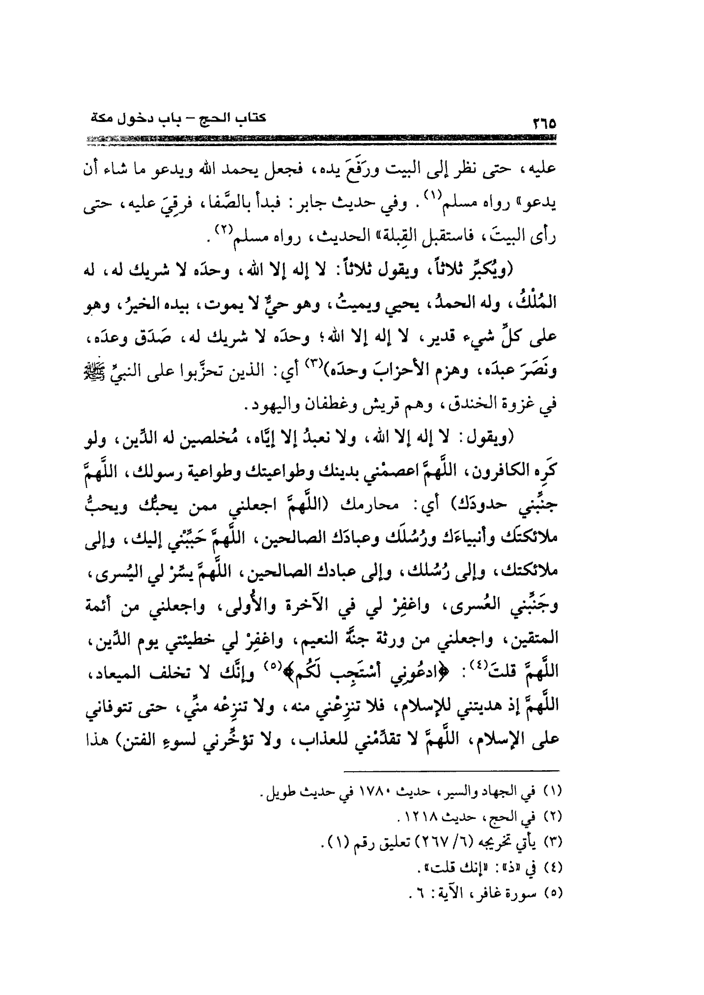 (ويُكبِّر ثلاثًا، ويقول ثلاثاً: لا إله إلا الله، وحدَه لا شريك له، له المُلْكُ، وله الحمدُ، يحيي ويميت، وهو حيٌّ لا يموت، بيده الخير، وهو على كلِّ شيء قدير، لا إله إلا الله؛ وحدَه لا شريك له، صَدَق وعدَه، ونَصَرَ جندَه، وهزم الأحزابَ وحدَه) (¬٣) أي: الذين تحزَّبوا على النبيِّ - صلى الله عليه وسلم - في غزوة الخندق، وهم قريش وغطفان واليهود.