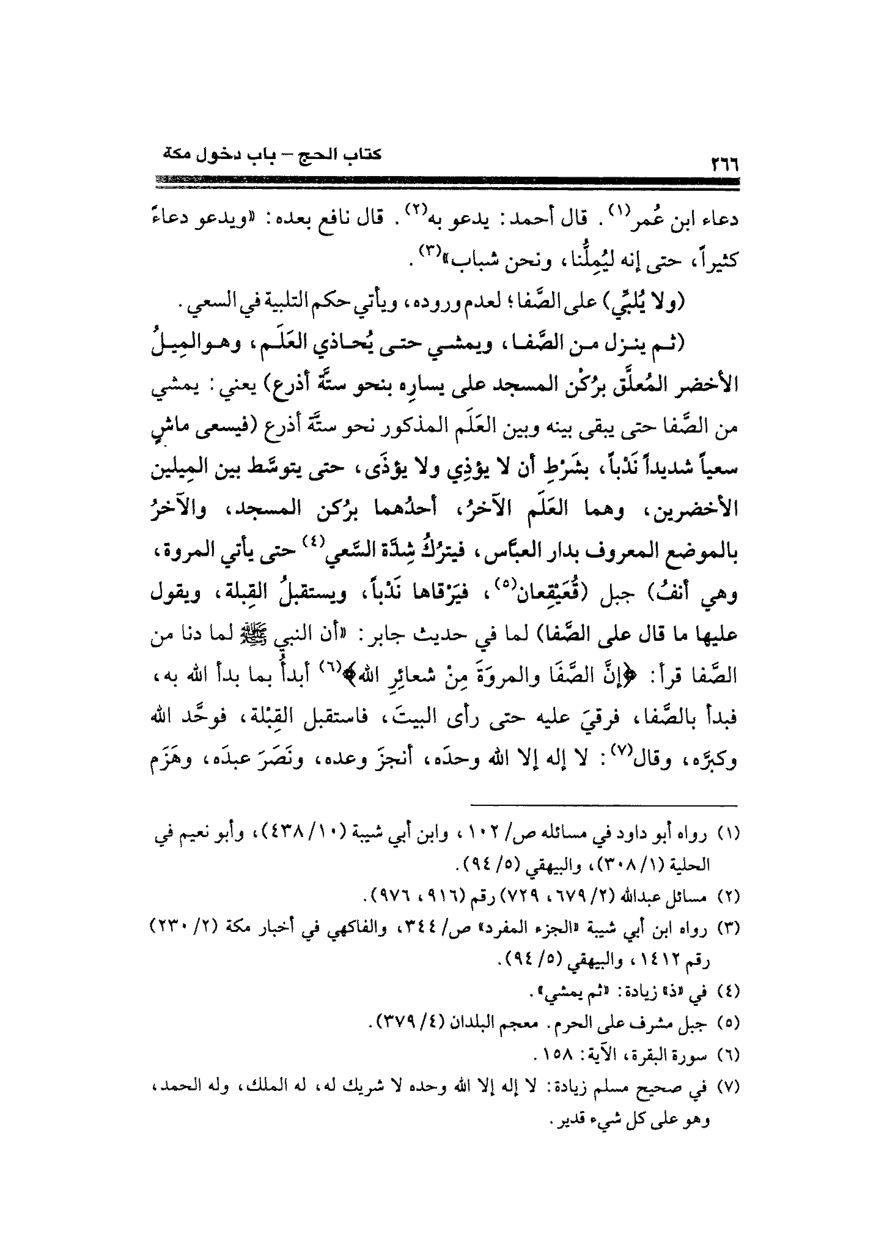 (ثم ينزل من الصَّفا، ويمشي حتى يُحاذي العَلَم، وهو المِيلُ الأخضر المُعلَّق برُكْن المسجد على يسارِه بنحو سته أذرع) يعني: يمشي من الصَّفا حتى يبقى بينه وبين العَلَم المذكور نحو ستَّة أذرع (فيسعى ماشٍ سعياً شديداً نَدْباً، بشَرْطِ أن لا يؤذِي ولا يؤذَى، حتى يتوسَّط بين المِيلين الأخضرين، وهما العَلَم الآخرُ، أحدهما برُكن المسجد، والآخرُ بالموضع المعروف بدار العبَّاس، فيترُكُ شِدَّة السَّعي (¬٤) حتى يأتي المروة، وهي أنفُ) جبل (قُعَيقِعان (¬٥)، فيَرْقاها نَدْباً، ويستقبلُ القِبلة، ويقول عليها ما قال على الصَّفا) لما في حديث جابر: "أن النبي - صلى الله عليه وسلم - لما دنا من الصَّفا قرأ: {إِنَّ الصَّفَا وَالْمَرْوَةَ مِنْ شَعَائِرِ اللَّهِ} (¬٦) أبدأُ بما بدأ الله به، فبدأ بالصَّفا، فرقيَ عليه حتى رأى البيتَ، فاستقبل القِبلة، فوحَّد الله وكبَّره، وقال (¬٧): لا إله إلا الله وحدَه، أنجزَ وعده، ونَصَرَ عبدَه، وهَزَم