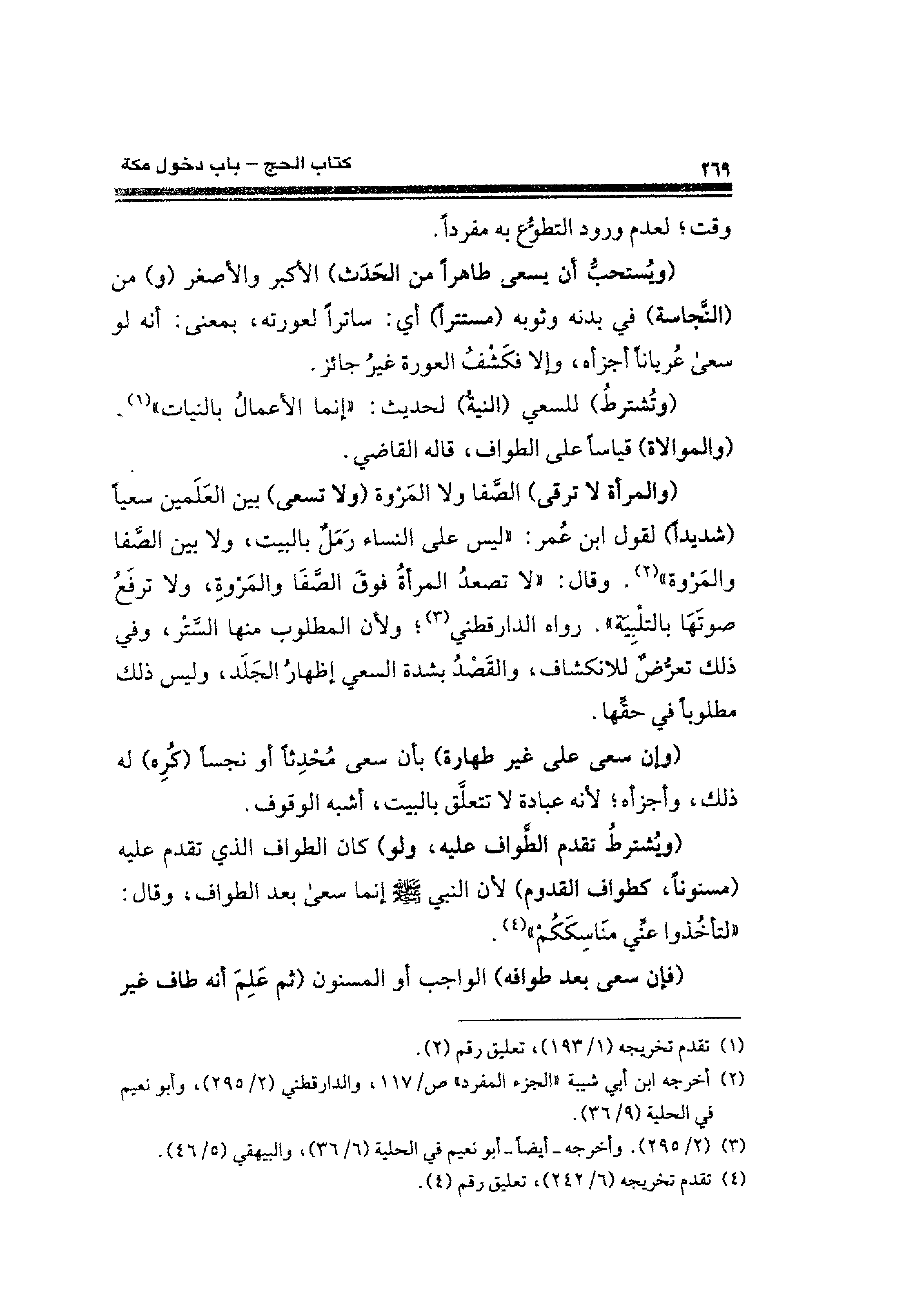 (والمرأة لا ترقى) الصَّفا ولا المَروة (ولا تسعى) ببن العَلَمين سعياً (شديداً) لقول ابن عُمر: (ليس على النساء رَمَلٌ بالبيت، ولا بين الصَّفا والمَروة) (¬٢). وقال: "لا تصعدُ المرأةُ فوقَ الصَّفَا والمَروةِ، ولا ترفَعُ صوتَهَا بالتلبِيَة". رواه الدارقطني (¬٣)؛ ولأن المطلوب منها السَّتْر، وفي ذلك تعرَّضٌ للانكشاف، والقَصدُ بشدة السعي إظهار الجَلَد، وليس ذلك مطلوباً في حقِّها.