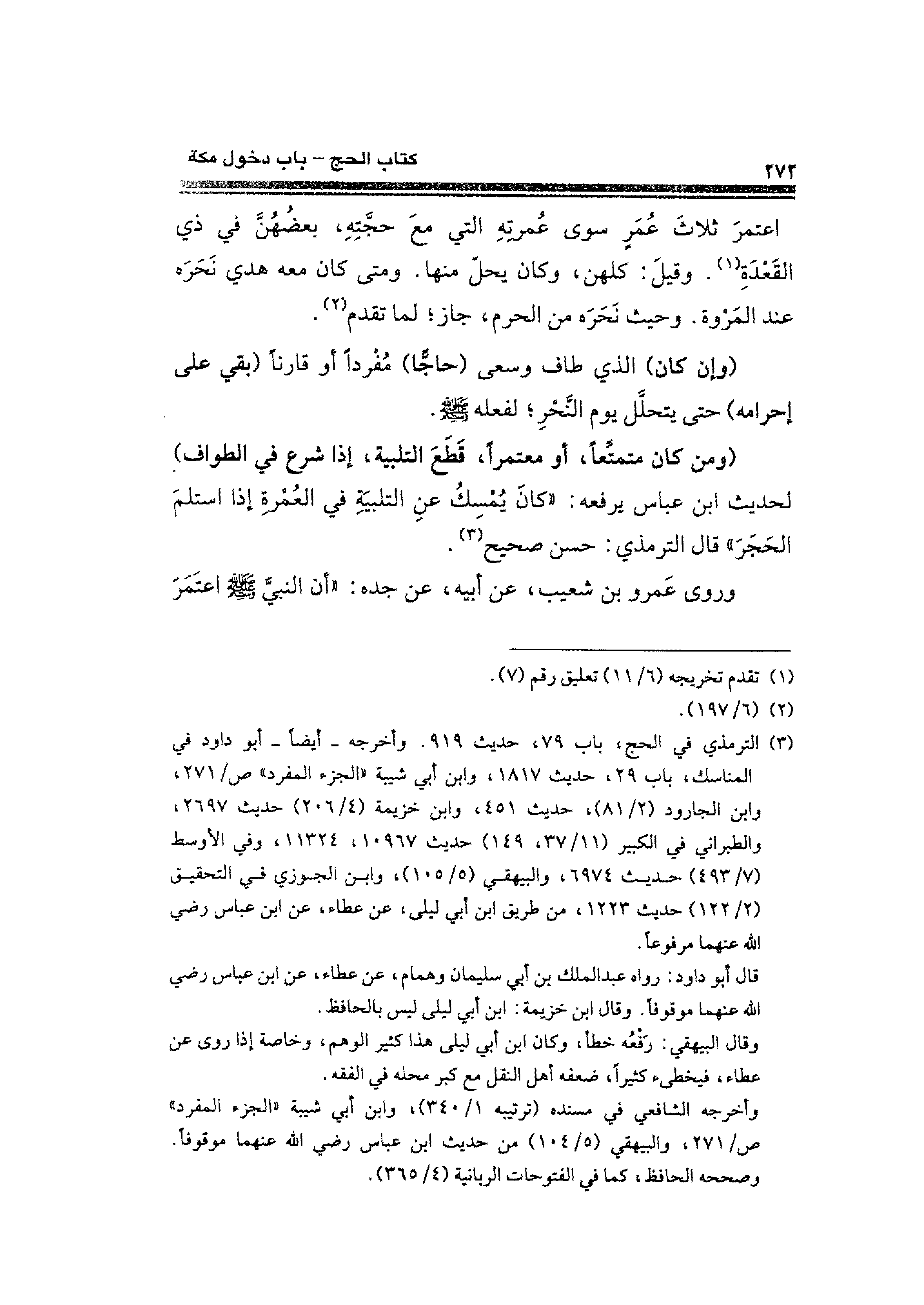(¬٣) الترمذي في الحج، باب ٧٩، حديث ٩١٩. وأخرجه -أيضًا- أبو داود في المناسك، باب ٢٩، حديث ١٨١٧، وابن أبي شيبة "الجزء المفرد" ص / ٢٧١، وابن الجارود (٢/ ٨١)، حديث ٤٥١، وابن خزيمة (٤/ ٢٠٦) حديث ٢٦٩٧، والطبراني في الكبير (١١/ ٣٧، ١٤٩) حديث ١٠٩٦٧، ١١٣٢٤، وفي الأوسط (٧/ ٤٩٣) حديث ٦٩٧٤، والبيهقي (٥/ ١٠٥)، وابن الجوزي في التحقيق (٢/ ١٢٢) حديث ١٢٢٣، عن طريق ابن أبي ليلى، عن عطاء، عن ابن عباس - رضي الله عنهما -.