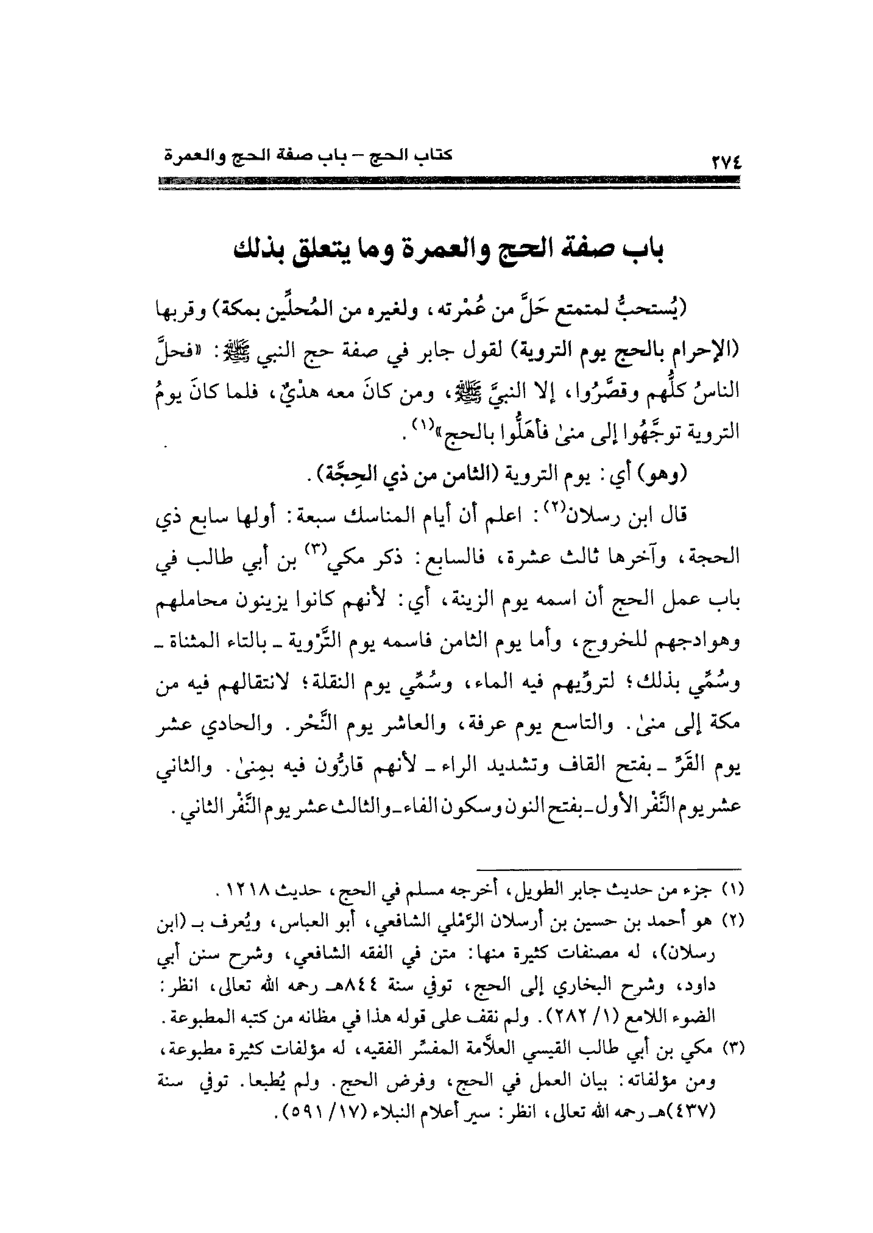 (¬٢) هو أحمد بن حسين بن أرسلان الرَّمْلي الشافعي، أبو العباس، ويُعرف بـ (ابن رسلان)، له مصنفات كثيرة منها: متن في الفقه الشافعي، وشرح سنن أبي داود، وشرح البخاري إلى الحج، توفي سنة ٨٤٤ هـ رحمه الله تعالى، انظر: الضوء اللامع (١/ ٢٨٢). ولم نقف على قوله هذا في مظانه من كتبه المطبوعة.