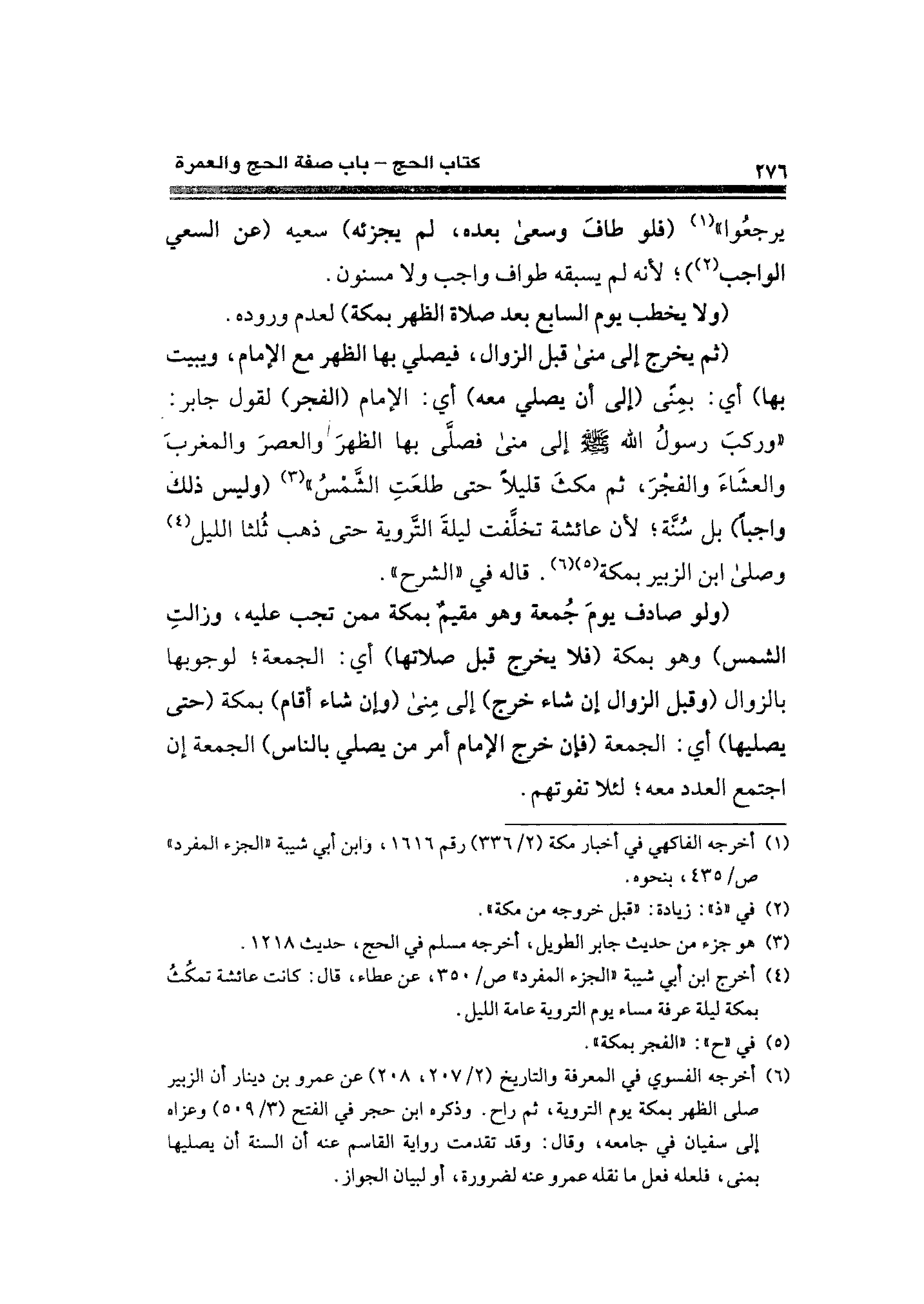 (¬٦) أخرجه الفسوي في المعرفة والتاريخ (٢/ ٢٠٧، ٢٠٨) عن عمرو بن دينار أن الزبير صلى الظهر بمكة يوم التروية، ثم راح. وذكره ابن حجر في الفتح (٣/ ٥٠٩) وعزاه إلى سفيان في جامعه، وقال: وقد تقدمت رواية القاسم عنه أن السنة أن يصليها بمنى، فلعله فعل ما نقله عمرو عنه لضرورة، أو لبيان الجواز.