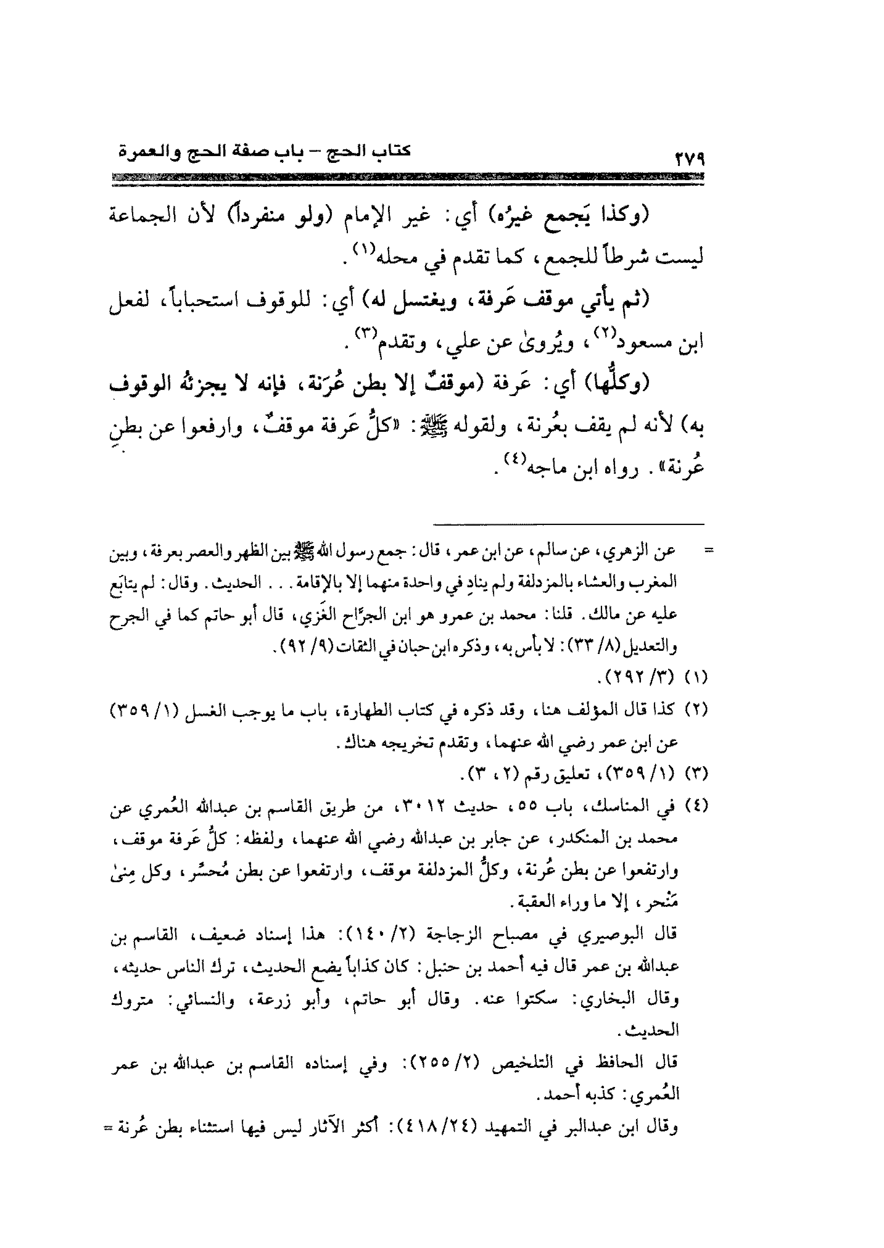 (¬٤) في المناسك، باب ٥٥، حديث ٣٠١٢، عن طريق القاسم بن عبد الله العُمري عن محمد بن المنكدر، عن جابر بن عبد الله - رضي الله عنهما -، ولفظه: كل عَرفة موقف، وارتفعوا عن بطن عُرنة، وكلُّ المزدلفة موقف، وارتفعوا عن بطن مُحسِّر، وكل مِنى مَنْحر" إلا ما وراء العقبة.