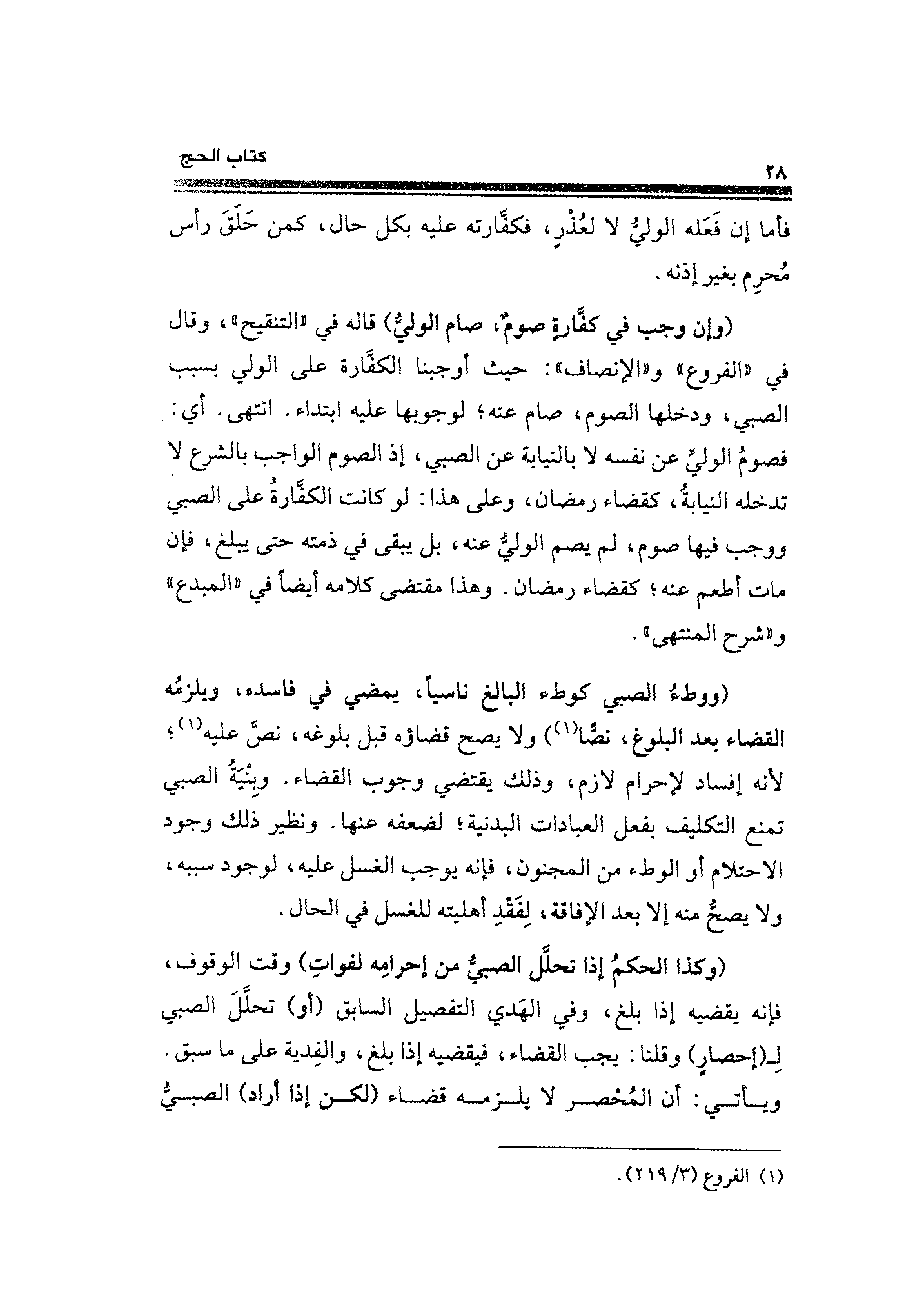 (ووطءُ الصبي كوطء البالغ ناسيًا، يمضي في فاسده، ويلزمُه القضاء بعد البلوغ، نصًّا (¬١) ولا يصح قضاؤه قبل بلوغه، نصَّ عليه (¬١)؛ لأنه إفساد لإحرام لازم، وذلك يقتضي وجوب القضاء. وبِنْيةُ الصبي تمنع التكليف بفعل العبادات البدنية؛ لضعفه عنها. ونظير ذلك وجود الاحتلام أو الوطء عن المجنون، فإنه يوجب الغسل عليه، لوجود سببه، ولا يصحُّ منه إلا بعد الإفاقة، لِفَقدِ أهليته للغسل في الحال.