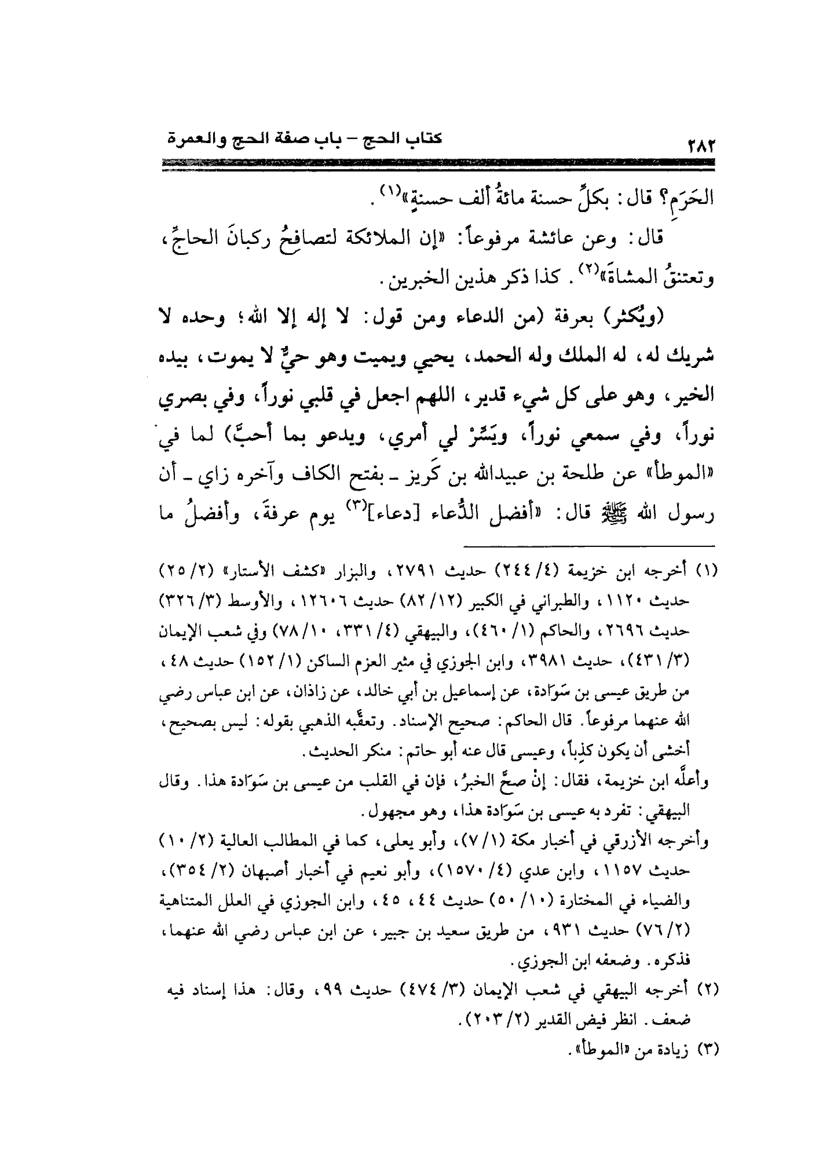 قال: وعن عائشة مرفوعًا: "إن الملائكة لتصافِحُ ركبانَ الحاجِّ، وتعتنقُ المشاةً" (¬٢). كذا ذكر هذين الخبرين.