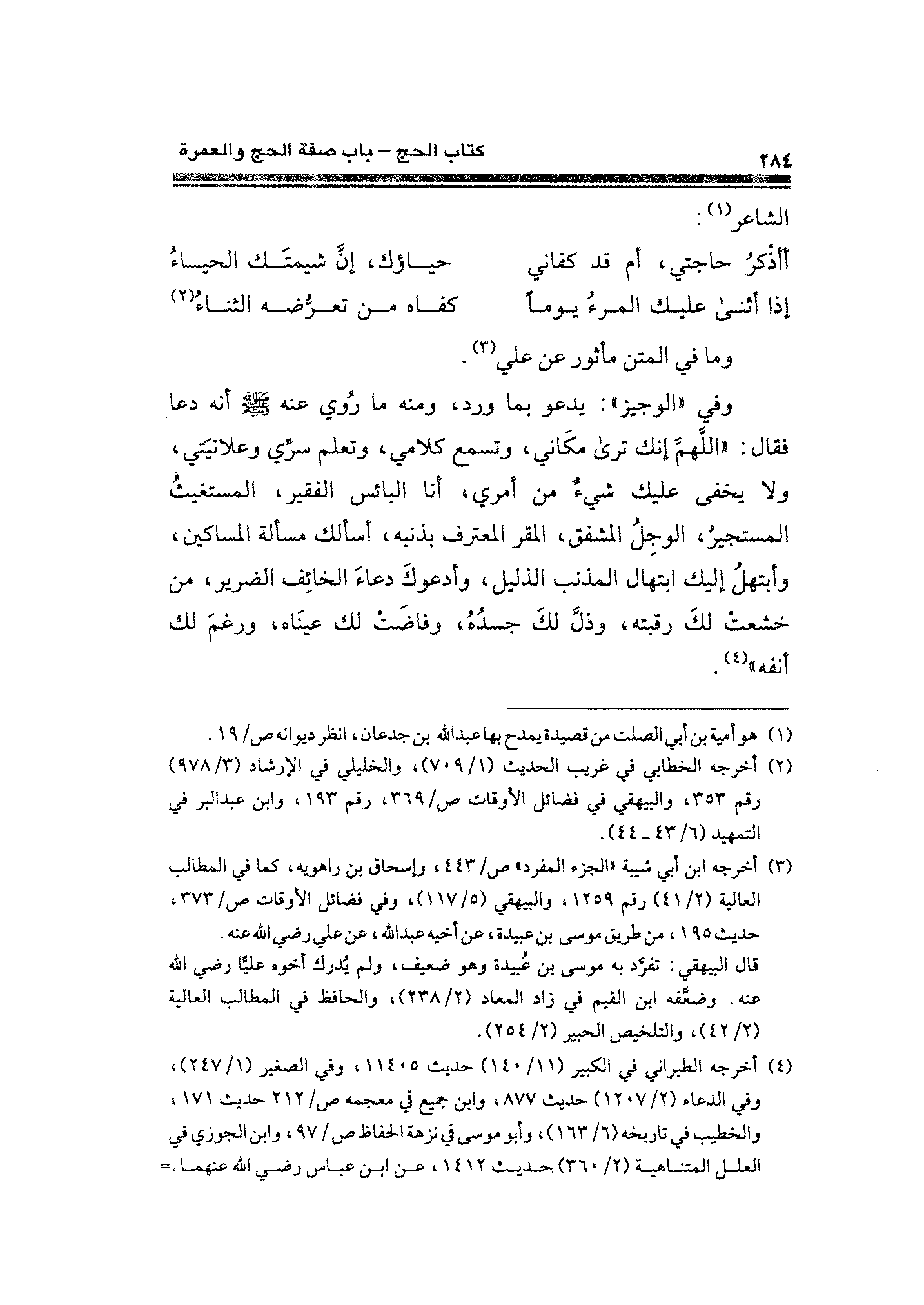 وفي "الوجيز": يدعو بما ورد، ومنه ما رُوي عنه - صلى الله عليه وسلم - أنه دعا فقال: "اللَّهمَّ إنك ترى مكَاني، وتسمع كلامي، وتعلم سرِّي وعلانيَتي، ولا يخفى عليك شيءٌ من أمري، أنا البائس الفقير، المستغيثُ المستجيرُ، الوجِلُ المشفق، المقر المعترف بذنبه، أسألك مسألة المساكين، وأبتهلُ إليك ابتهال المذنب الذليل، وأدعوكَ دعاءَ الخائِف الضرير، من خشعتْ لكَ رقبته، وذلَّ لكَ جسدُهُ، وفاضَتْ لك عينَاه، ورغمَ لك أنفه" (¬٤).