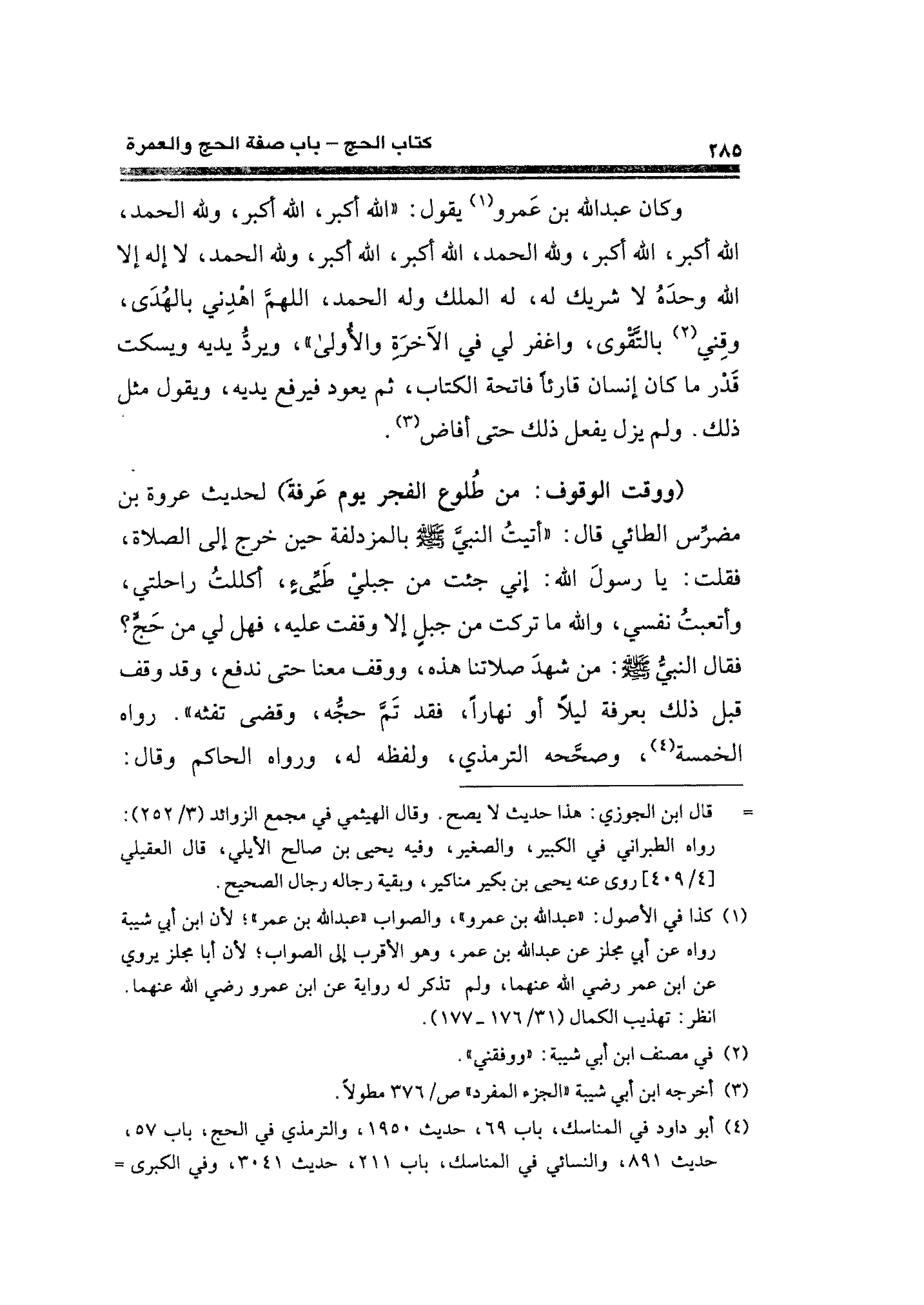 وكان عبد الله بن عَمرو (¬١) يقول: "الله أكبر، الله أكبر، ولله الحمد، الله أكبر، الله أكبر، ولله الحمد، الله أكبر، الله أكبر، ولله الحمد، لا إله إلا الله وحدَهُ لا شريك له، له الملك وله الحمد، اللهمَّ اهْدِني بالهُدَى، وقِني (¬٢) بالتَّقْوى، واغفر لي في الآخرَةِ والأُولى"، ويردُّ يديه ويسكت قَدْر ما كان إنسان قارئًا فاتحة الكتاب، ثم يعود فيرفع يديه، ويقول مثل ذلك. ولم يزل يفعل ذلك حتى أفاض (¬٣).