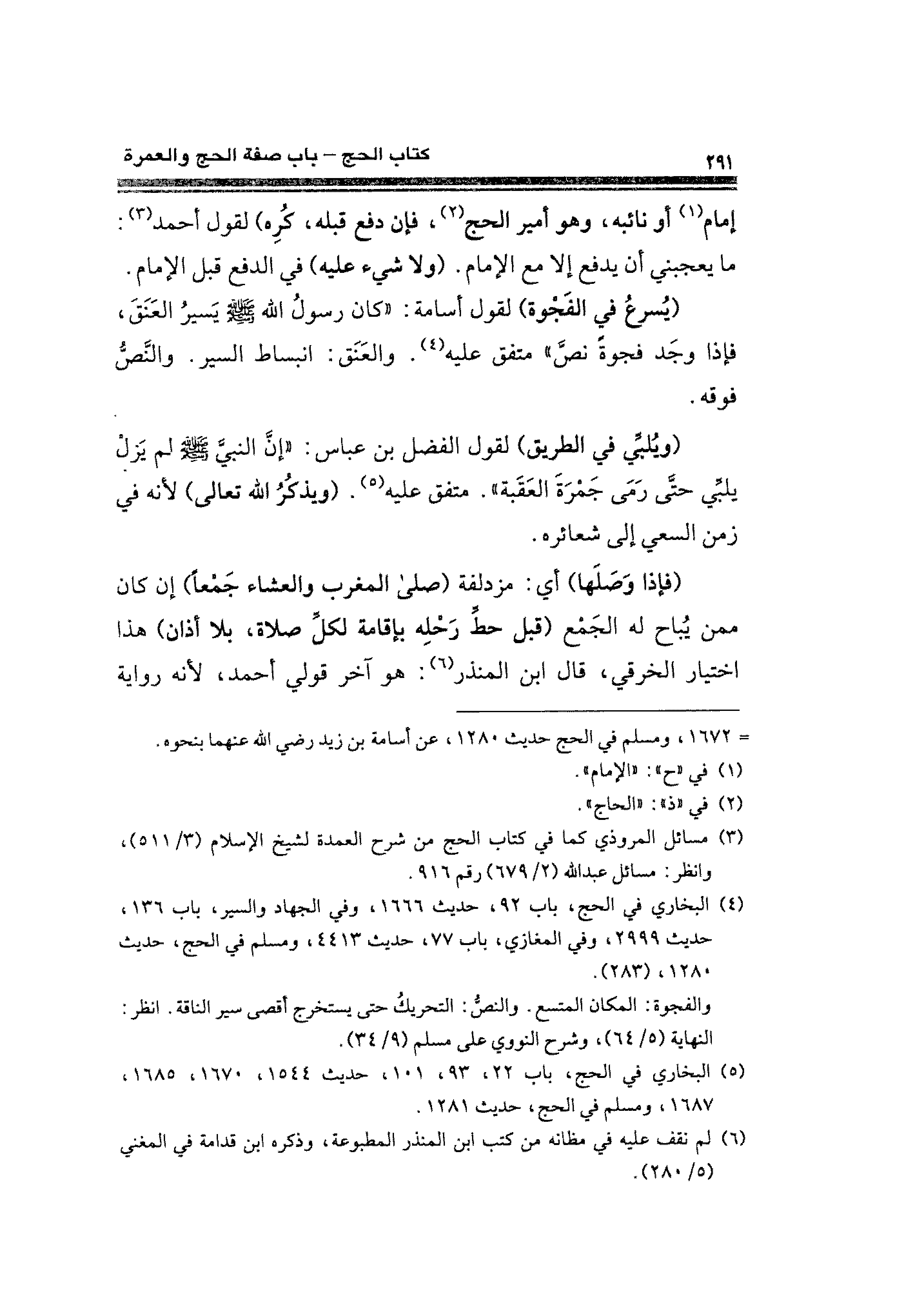 إمام (¬١) أو نائبه، وهو أمير الحج (¬٢)، فإن دفع قبله، كرِه) لقول أحمد (¬٣): ما يعجبني أن يدفع إلا مع الإمام. (ولا شيء عليه) في الدفع قبل الإمام.