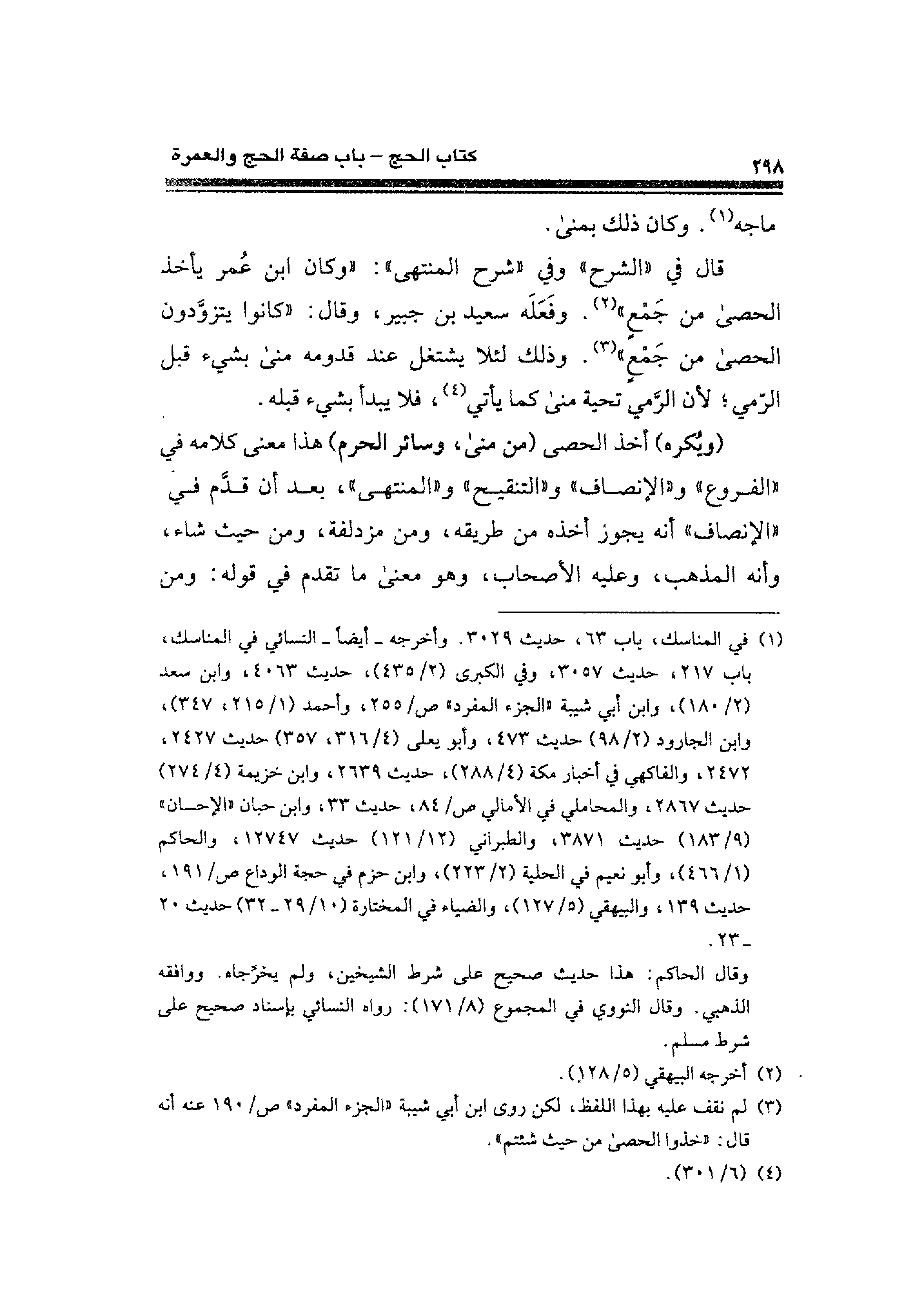 قال في "الشرح" وفي "شرح المنتهى": "وكان ابن عمر يأخذ الحصى من جَمعٍ" (¬٢). وفَعَلَه سعيد بن جبير، وقال: "كانوا يتزوَّدون الحصى من جَمْعٍ" (¬٣). وذلك لئلا يشتغل عند قدومه منى بشيء قبل الرمي؛ لأن الرَّمي تحية منى كما يأتي (¬٤)، فلا يبدأ بشيء قبله.