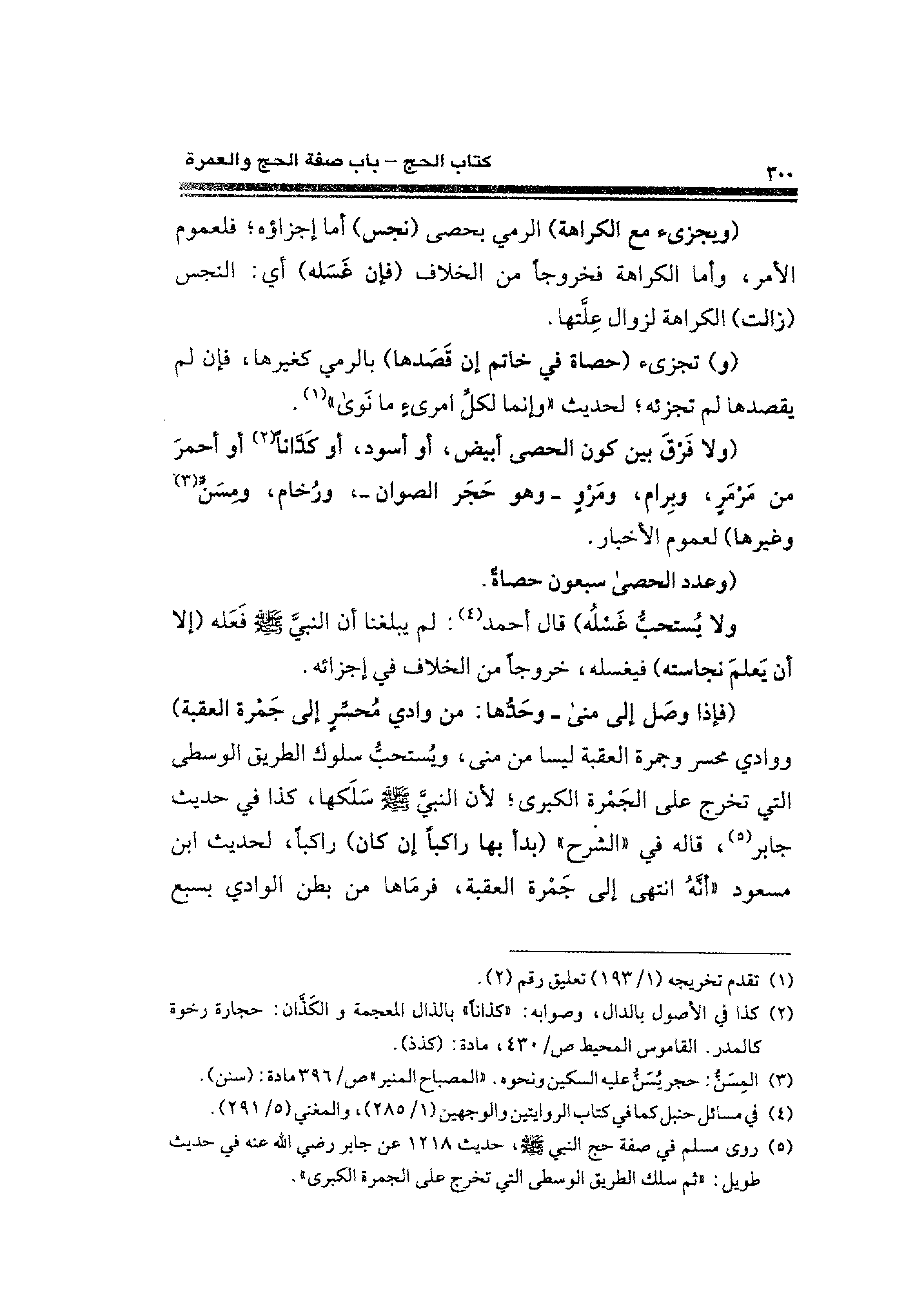 (¬٥) روى مسلم في صفة حج النبي - صلى الله عليه وسلم -، حديث ١٢١٨ عن جابر رضي - رضي الله عنه - في حديث طويل: "ثم سلك الطريق الوسطى التي تخرج على الجمرة الكبرى".