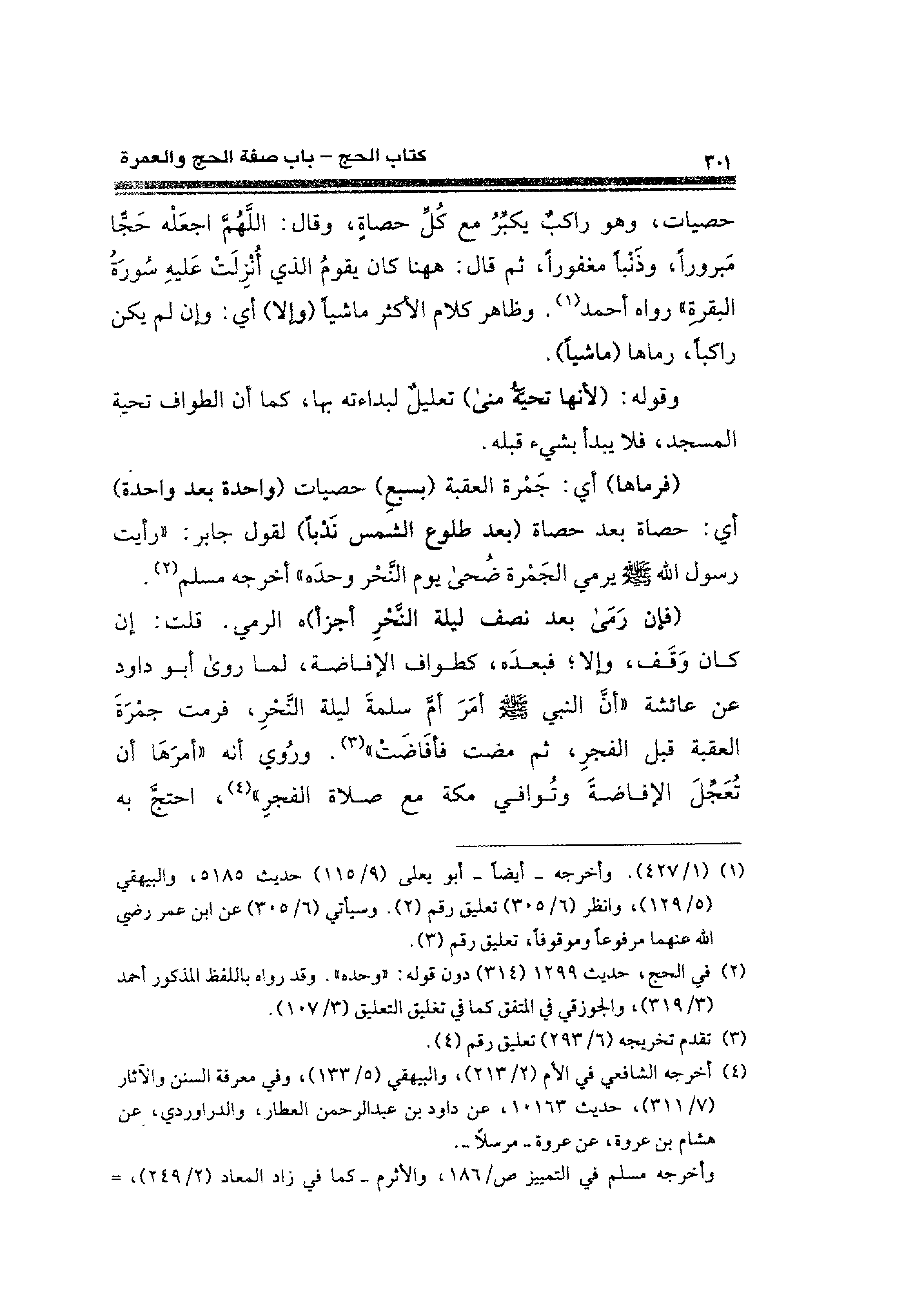 حصيات، وهو راكبٌ يكبِّرُ مع كُل حصاةٍ، وقال: اللَّهُمَّ اجعَلْه حجًّا مَبرورًا، وذَنبًا مغفورًا، ثم قال: ها هنا كان يقومُ الذي أُنزِلَت عَليهِ سُورةُ البقرةِ" رواه أحمد (¬١). وظاهر كلام الأكثر ماشيًا (والا) أي: وإن لم يكن راكبًا، رماها (ماشيًا).