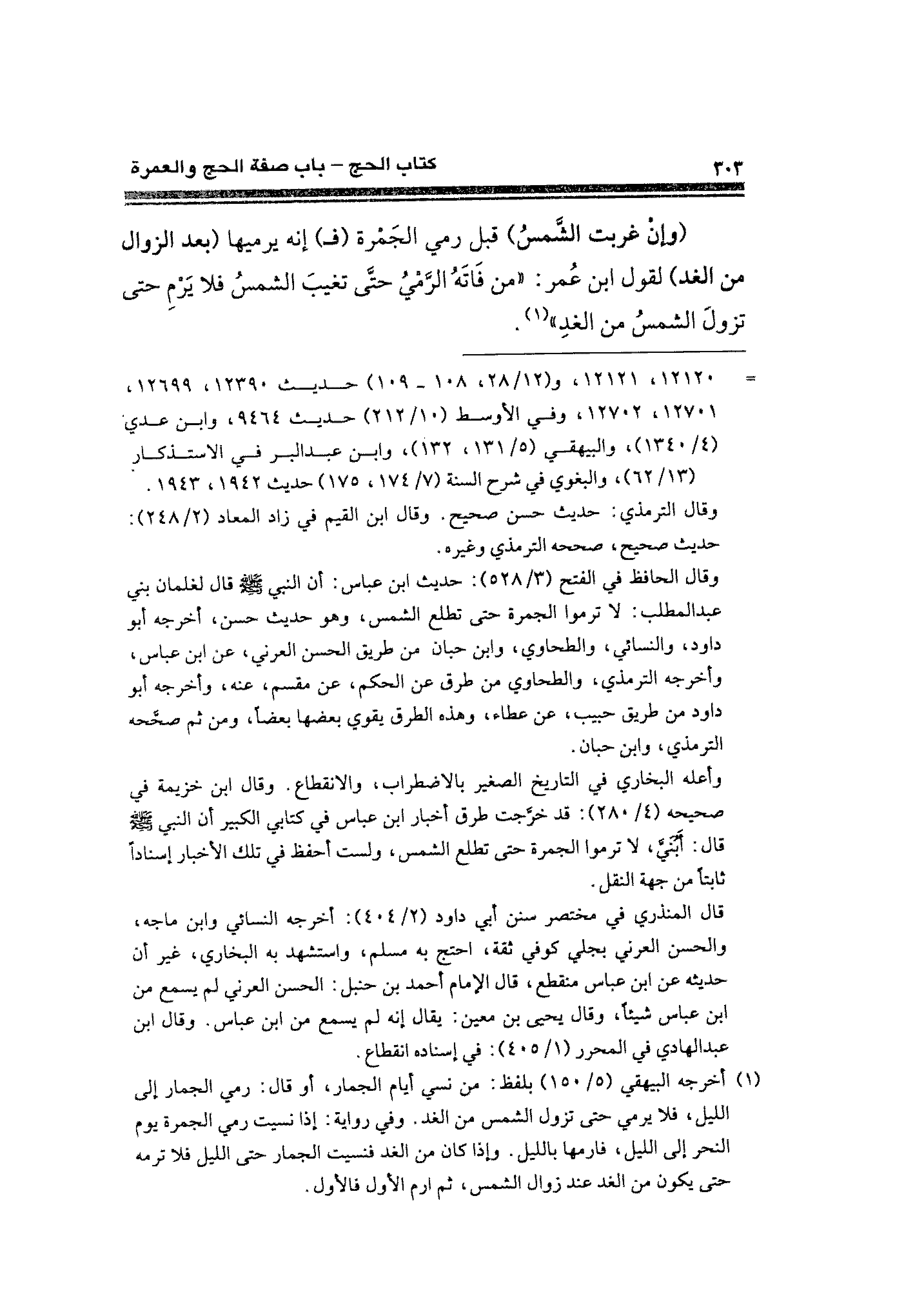وقال الحافظ في الفتح (٣/ ٥٢٨): حديث ابن عباس: أن النبي - صلى الله عليه وسلم - قال لغلمان بني عبد المطلب: لا ترموا الجمرة حتى تطلع الشمس، وهو حديث حسن، أخرجه أبو داود، والنسائي، والطحاوي، وابن حبان من طريق الحسن العرني، عن ابن عباس، وأخرجه الترمذي، والطحاوي من طرق عن الحكم، عن مقسم، عنه، وأخرجه أبو داود من طريق حبيب، عن عطاء، وهذه الطرق يقوي بعضها بعضًا، ومن ثم صحَّحه الترمذي، وابن حبان.