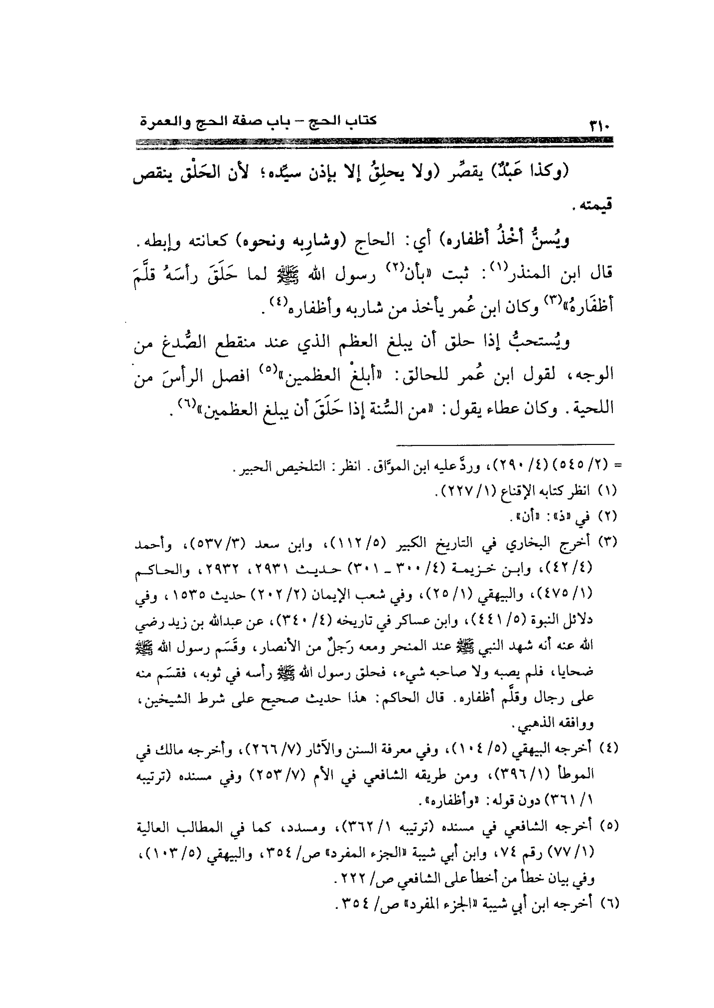 (¬٤) أخرجه البيهقي (٥/ ١٠٤)، وفي معرفة السنن والآثار (٧/ ٢٦٦)، وأخرجه مالك في الموطأ (١/ ٣٩٦)، ومن طريقه الشافعي في الأم (٧/ ٢٥٣) وفي مسنده (ترتيبه ١/ ٣٦١) دون قوله: "وأظفاره".