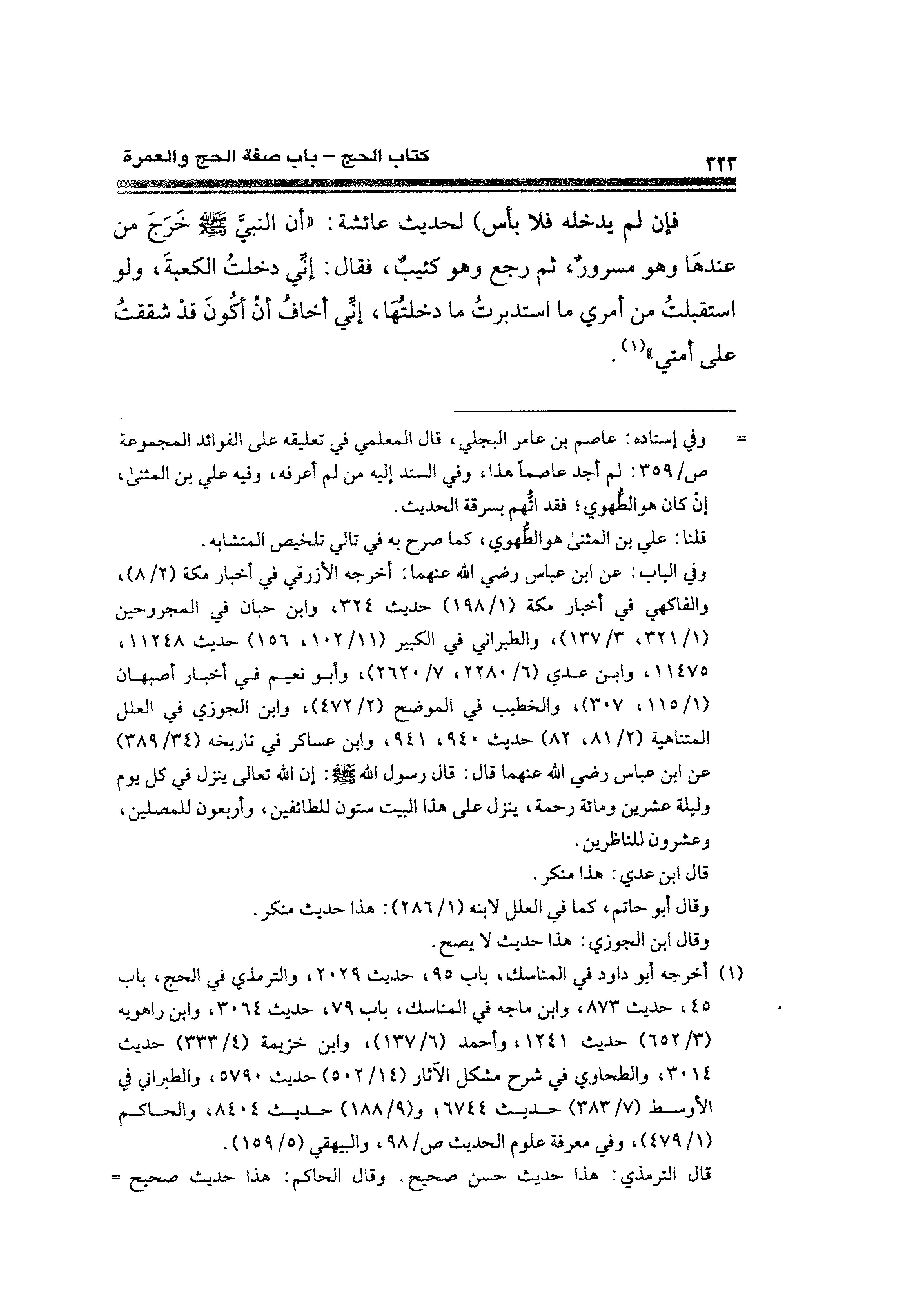 (¬١) أخرجه أبو داود في المناسك، باب ٩٥، حديث ٢٥٣٩، والترمذي في الحج، باب ٤٥، حديث ٨٧٣، وابن ماجه في المناسك، باب ٧٩، حديث ٣٠٦٤، وابن راهويه (٣/ ٦٥٢) حديث ١٢٤١، وأحمد (٦/ ١٣٧)، وابن خزيمة (٤/ ٣٣٣) حديث ٣٠١٤، والطحاوي في شرح مشكل الآثار (١٤/ ٥٠٢) حديث ٥٧٩٠، والطبراني في الأوسط (٧/ ٣٨٣) حديث ٦٧٤٤، و (٩/ ١٨٨) حديث ٨٤٠٤، والحاكم (١/ ٤٧٩)، وفي معرفة علوم الحديث ص/ ٩٨، والبيهقي (٥/ ١٥٩).