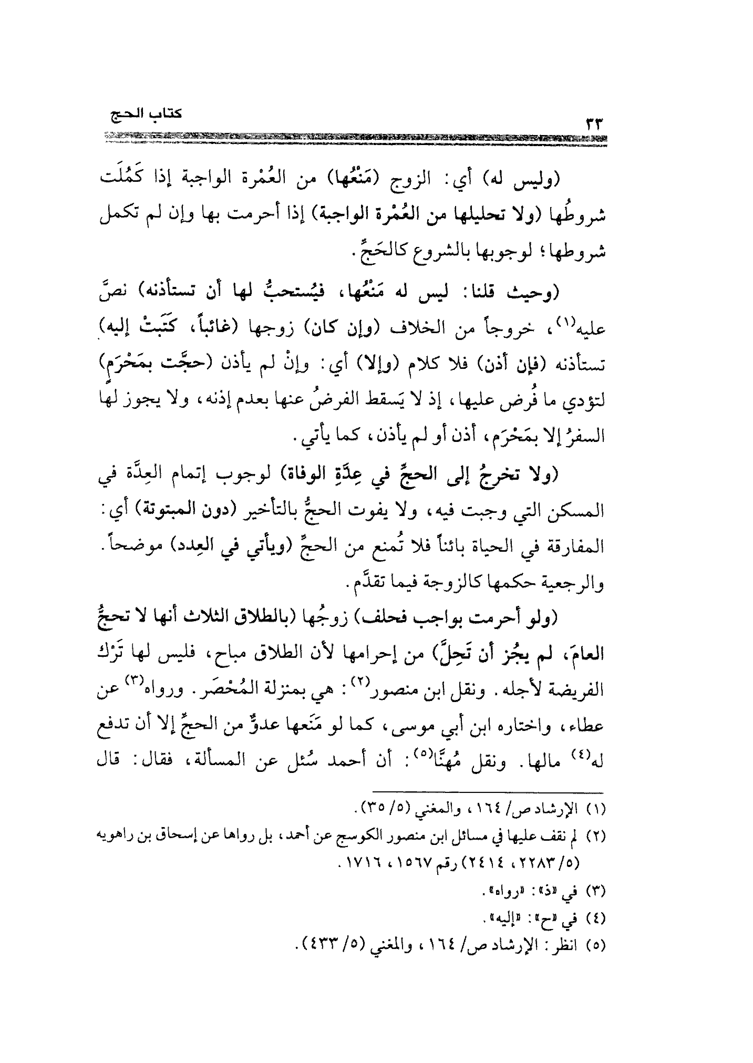 (وليس له) أي: الزوجْ (مَنْعُها) من العمرة الواجبة إذا كَمُلَت شروطُها (ولا تحليلها من العمرة الواجبة) إذا أحرمت بها وإن لم تكمل شروطها؛ لوجوبها بالشروع كالحَج.