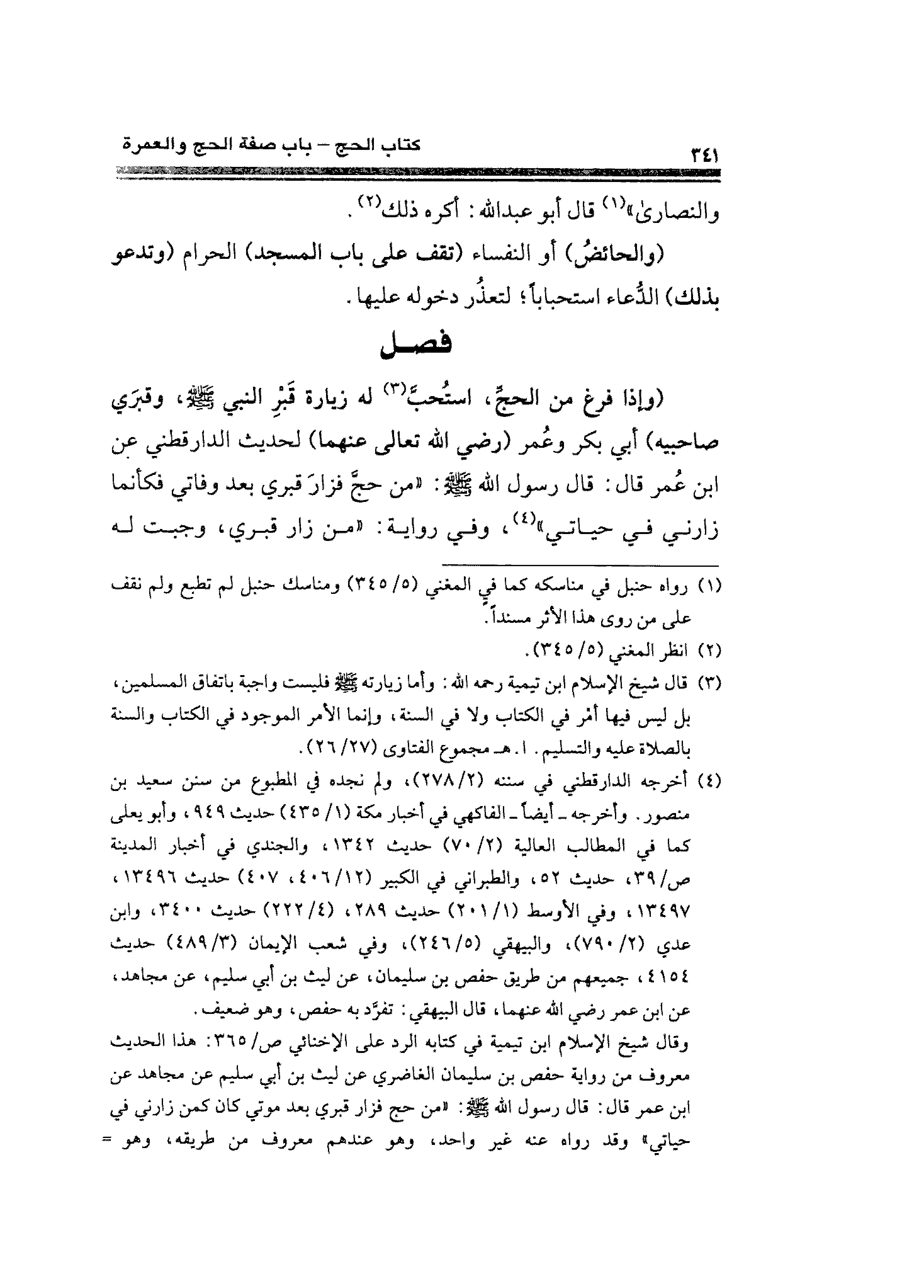 (وإذا فرغ من الحجِّ، استُحبَّ (¬٣) له زيارة قَبْرِ النبي - صلى الله عليه وسلم -، وقبرَي صاحبيه) أبي بكر وعُمر (رضي الله تعالى عنهما) لحديث الدارقطني عن ابن عُمر قال: قال رسول الله - صلى الله عليه وسلم -: "من حجَّ فزارَ قبرى بعد وفاتي فكأنما زارني في حياتي" (¬٤)، وفي رواية: "من زار قبري، وجبت له