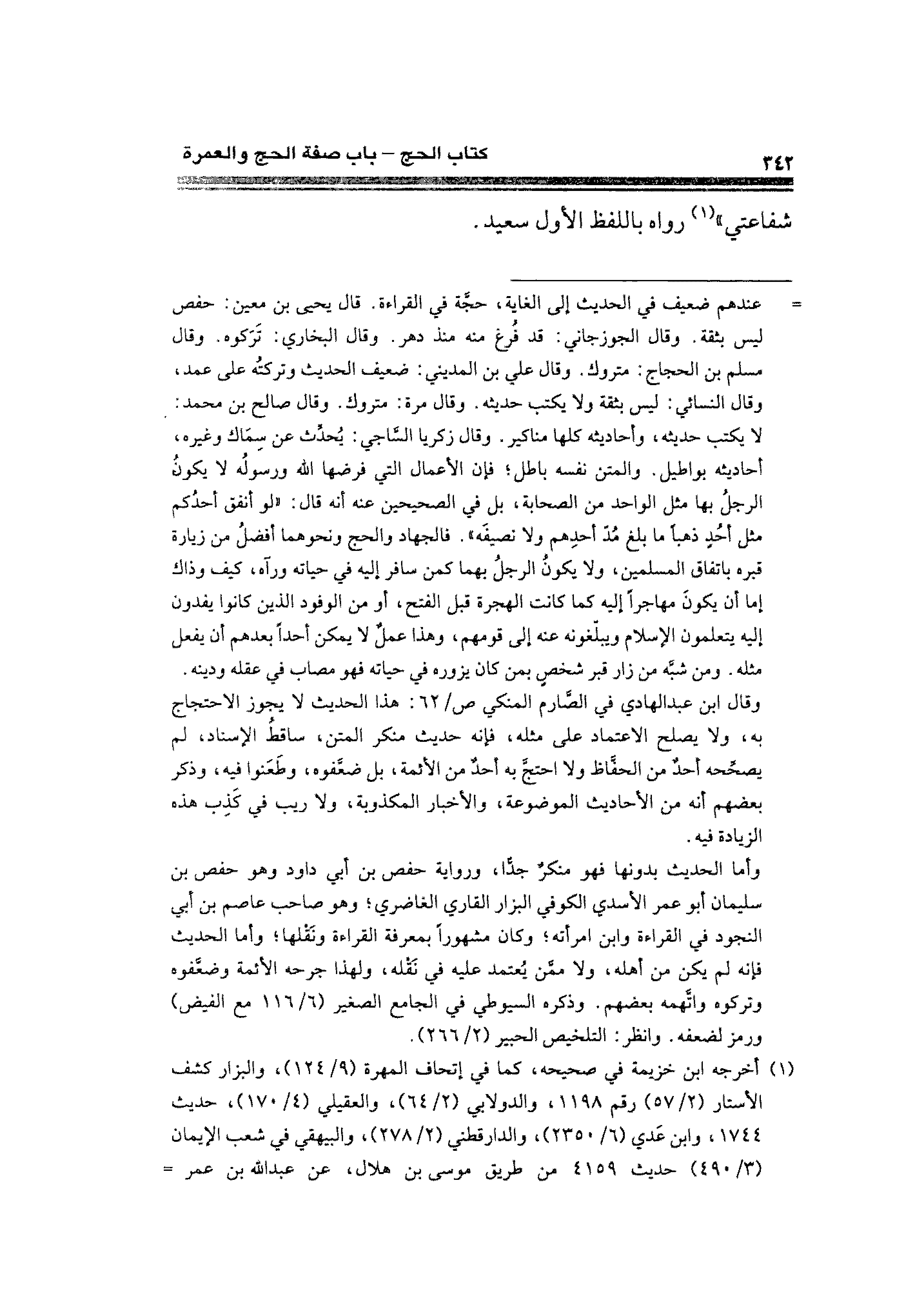 = عندهم ضعيف في الحديث إلى الغاية، حجَّة في القراءة. قال يحيى بن معين: حفص ليس بثقة. وقال الجوزجاني: قد فُرغ منه منذ دهر. وقال البخاري: تَرَكوه. وقال مسلم بن الحجاج: متروك. وقال علي بن المديني: ضعيف الحديث وتركتُه على عمد، وقال النسائي: ليس بثقة ولا يكتب حديثه. وقال مرة متروك. وقال صالح بن محمد: لا يكتب حديثه، وأحاديثه كلها مناكير. وقال زكريا السَّاجي: يُحدِّث عن سِمَاك وغيره، أحاديثه بواطيل. والمتن نفسه باطل، فإن الأعمال التي فرضها الله ورسولُه لا يكونُ الرجلُ بها مثل الواحد من الصحابة، بل في الصحيحين عنه أنه قال: "لو أنفق أحدُكم مثل أحُدٍ ذهباً ما بلغ مُدّ أحدِهم ولا نصيفَه". فالجهاد والحج ونحوهما أفضلُ من زيارة قبره باتفاق المسلمين، ولا يكونُ الرجلُ بهما كمن سافر إليه في حياته ورآه، كيف وذاك إما أن يكونَ مهاجراً إليه كما كانت الهجرة قبل الفتح، أو من الوقود الذين كانوا يفدون إليه يتعلمون الإسلام ويبلّغونه عنه إلى قومهم، وهذا عملٌ لا يمكن أحداً بعدهم أن يفعل مثله. ومن شبَّه من زار قبر شخصٍ بمن كان يزوره في حياته فهو مصاب في عقله وديته. وقال ابن عبد الهادي في الصَّارم المنكي ص/ ٦٢: هذا الحديث لا يجوز الاحتجاج به، ولا يصلح الاعتماد على مثله، فإنه حديث منكر المتن، ساقطُ الإسناد؛ لم يصحِّحه أحدٌ من الحفَّاظ ولا احتجَّ به أحدٌ من الأئمة، بل ضعَّفوه، وطَعَنوا فيه، وذكر بعضهم أنه من الأحاديث الموضوعة، والأخبار المكذوبة، ولا ريب في كَذِب هذه الزيادة فيه.